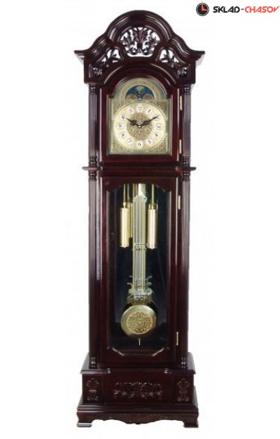Корпус :Дерево: Твердая липа, ручная резьба по дереву, стеклянные боковины корпуса и зеркальная задняя стенка. Циферблат: металл с арабскими цифрами. Механизм: 31 дневная заводная механическая механика. Завод ключом. Двух-тональный бой (каждый час и каждые пол часа). Опция ручного отключения боя. Размер: 2050*570*265 мм Размер упаковки: 2090*610*315 мм