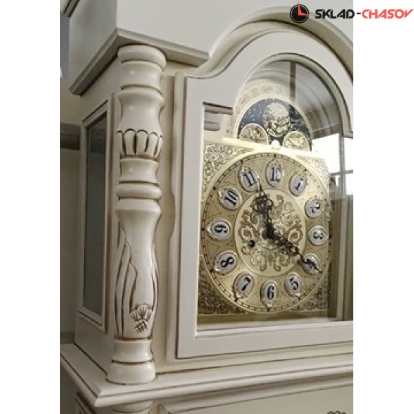 Массив липы, ручная резьба. Часы механические.Цвет: слоновая кость с патиной золото, Циферблат с римскими цифрами, Маятник + подвесные гири 3 - штуки 31-дневный мощный механизм с функцией отключения и зеркалом на задней стене Размер: 2030*540*265 мм Размер коробки: 2110*600*350 мм