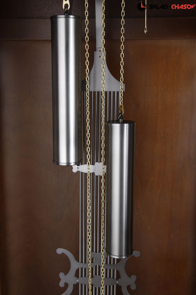 Немецкий механизм Hermle - цепной подвес гирь, 8-дневный запас хода, бой каждые 1/2 часа и в ровный час, с возможностью ручного отключения.