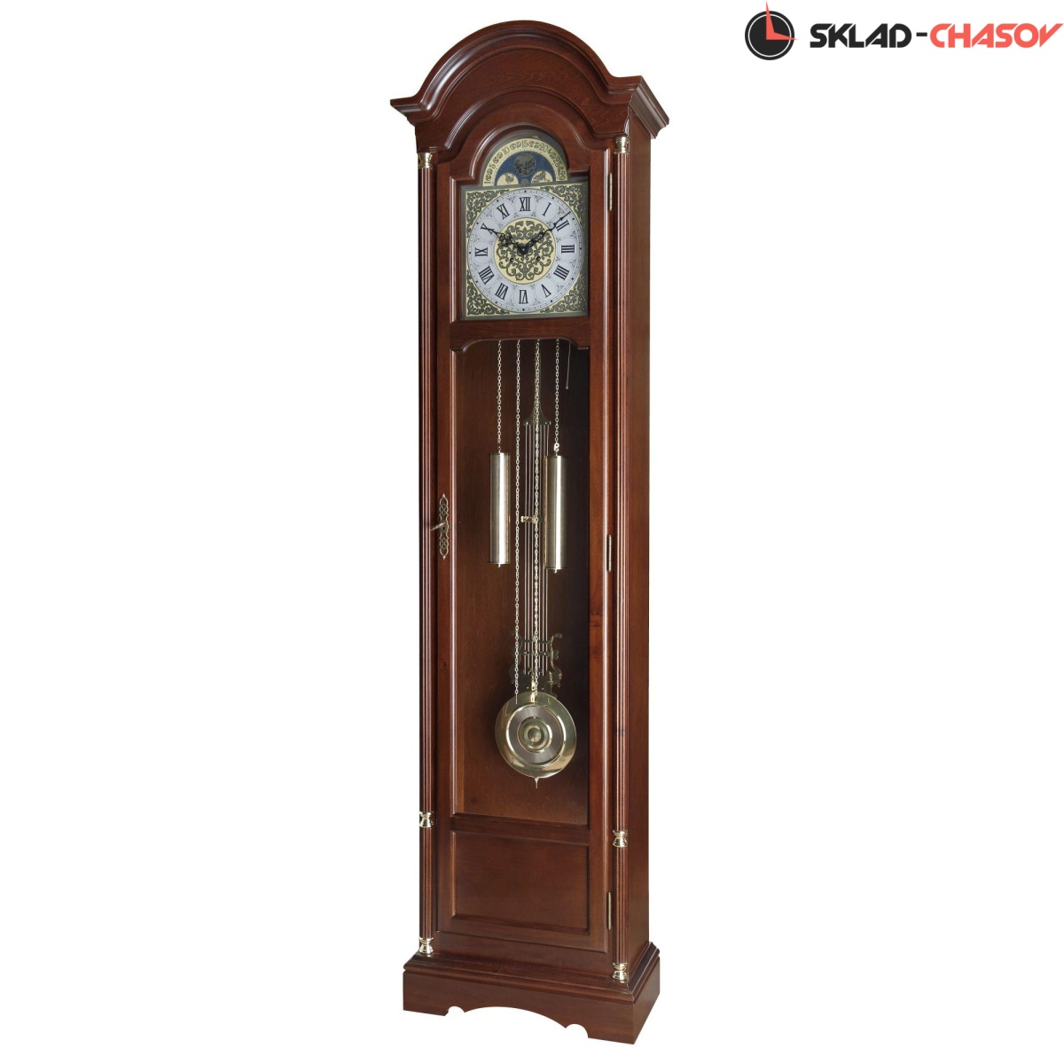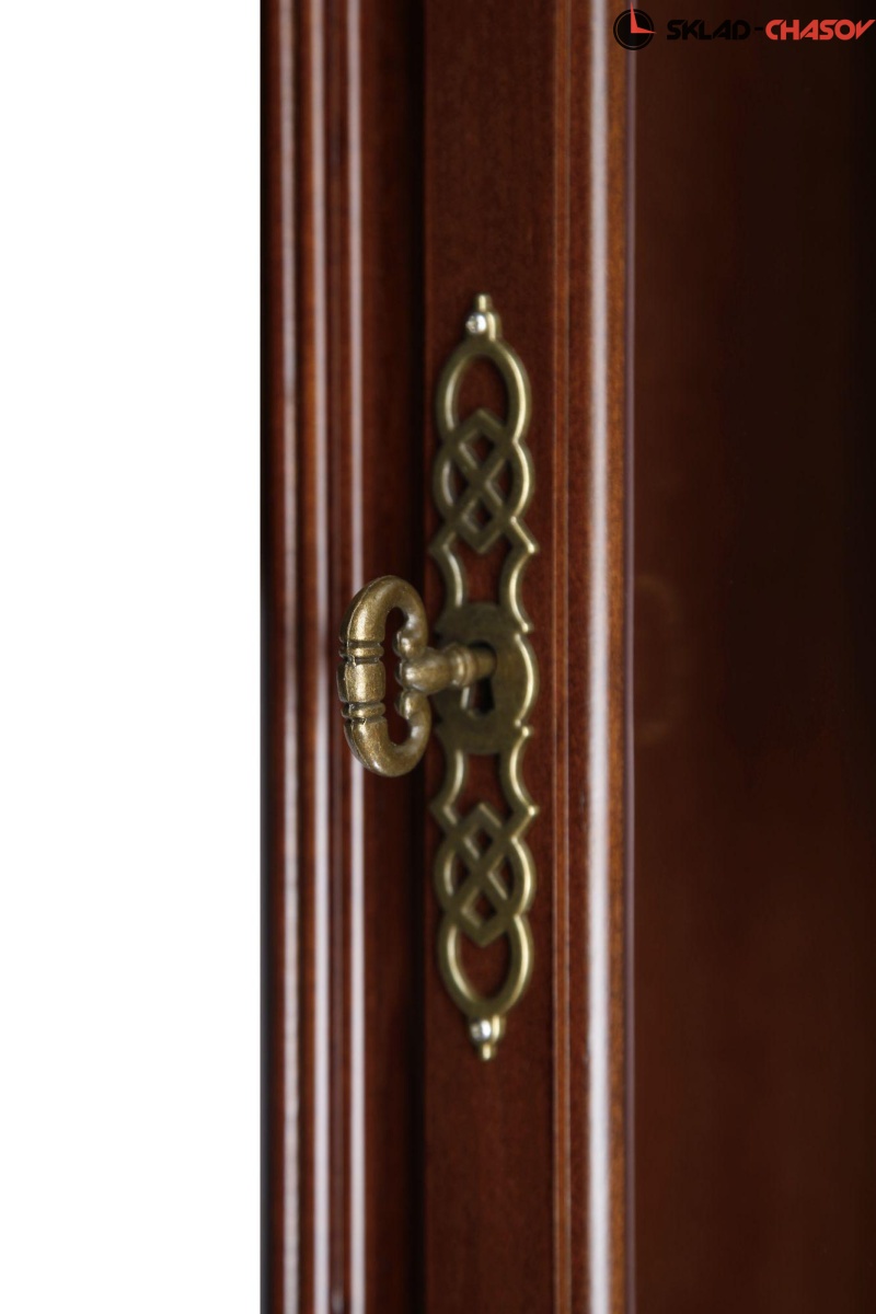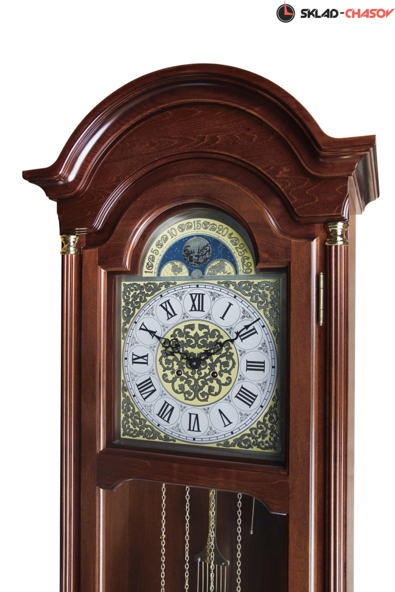 Механические напольные часы в классическом корпусе. Корпус выполнен из массива твердых пород дерева и частично покрыт шпоном. Тонировка корпуса выполнена в цвете "орех".