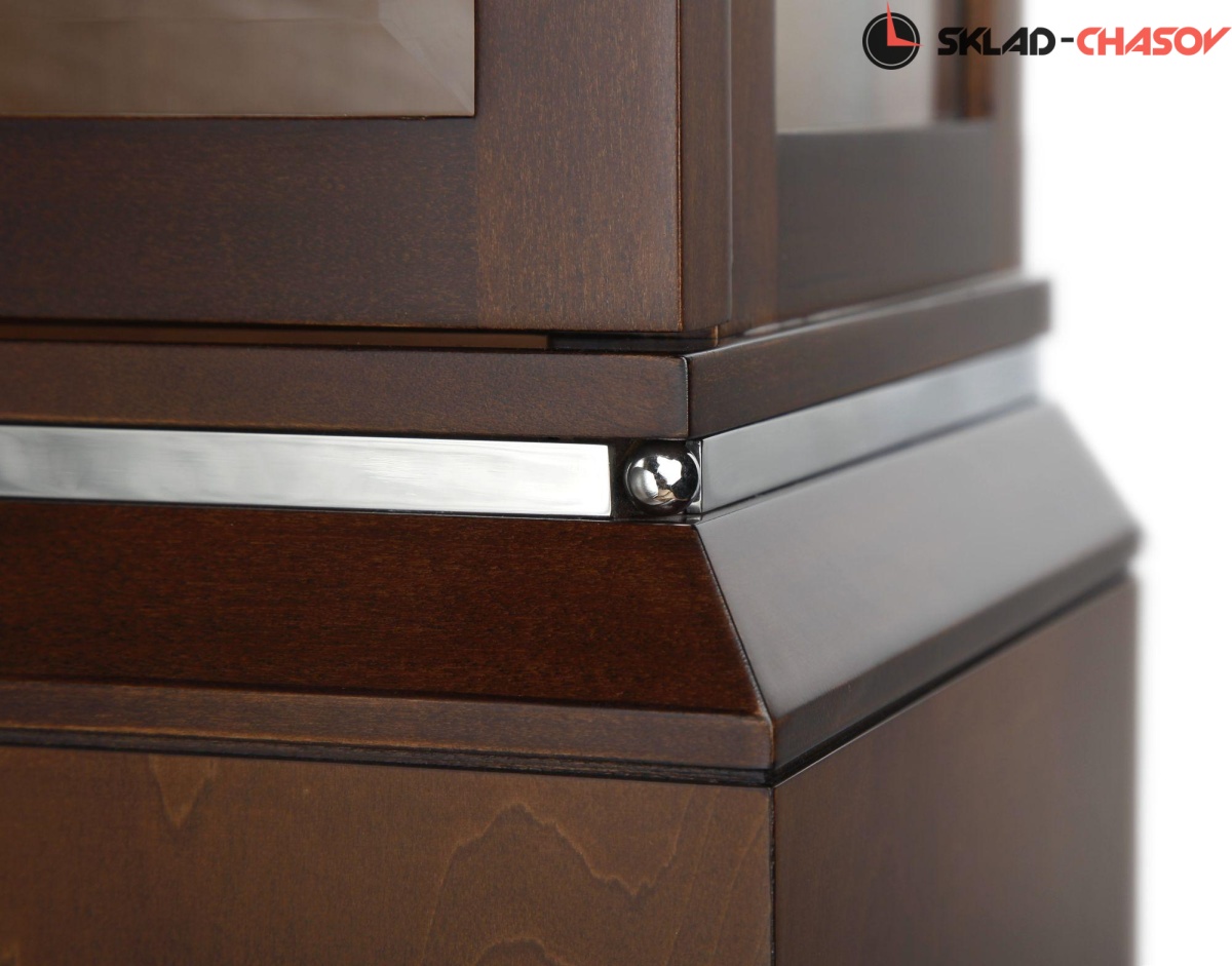Механические напольные часы в классическом корпусе. Корпус выполнен из массива твердых пород дерева и частично покрыт шпоном. Тонировка корпуса выполнена в цвете "орех".
