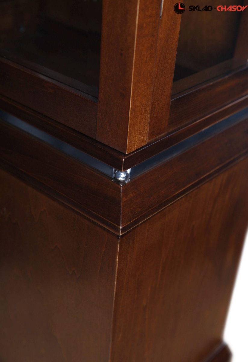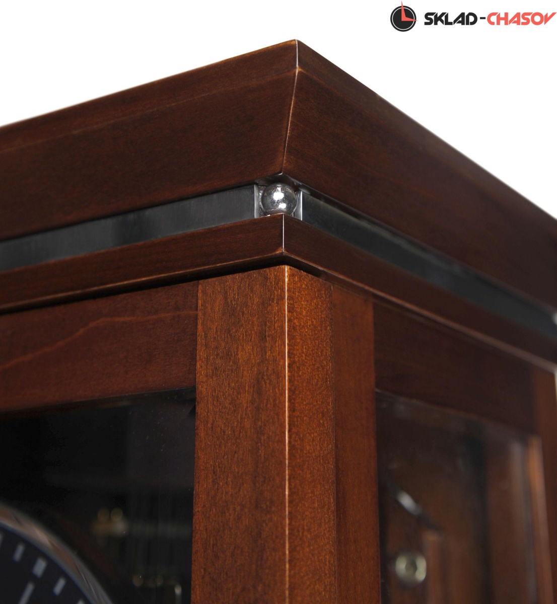Механические напольные часы в классическом корпусе. Корпус выполнен из массива твердых пород дерева и частично покрыт шпоном. Тонировка выполнена в цвете "орех".