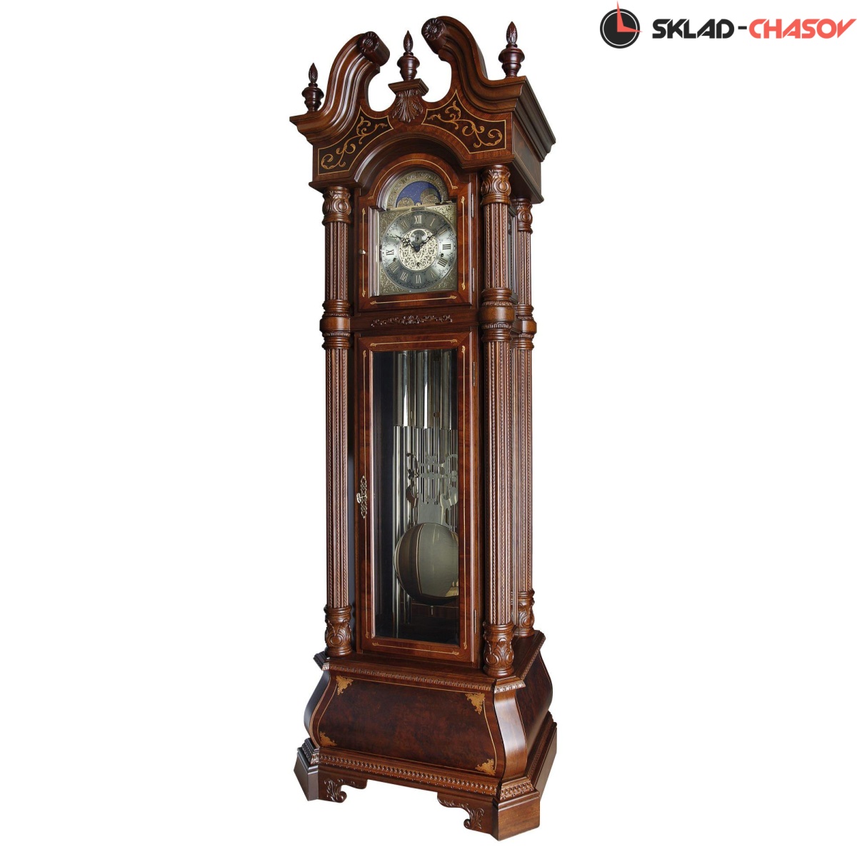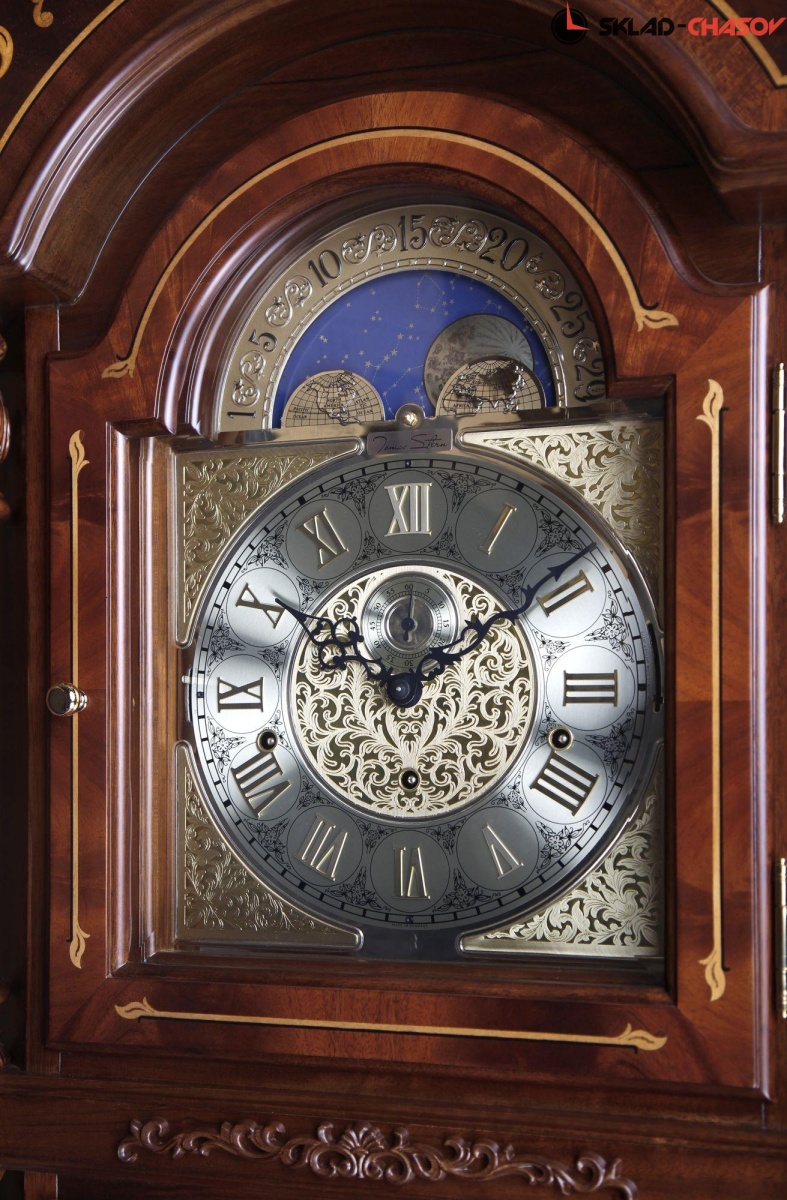 Массивный корпус этих огромных напольных часов выполнен из массива и тонирован в цвете орех.