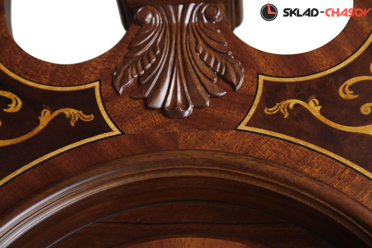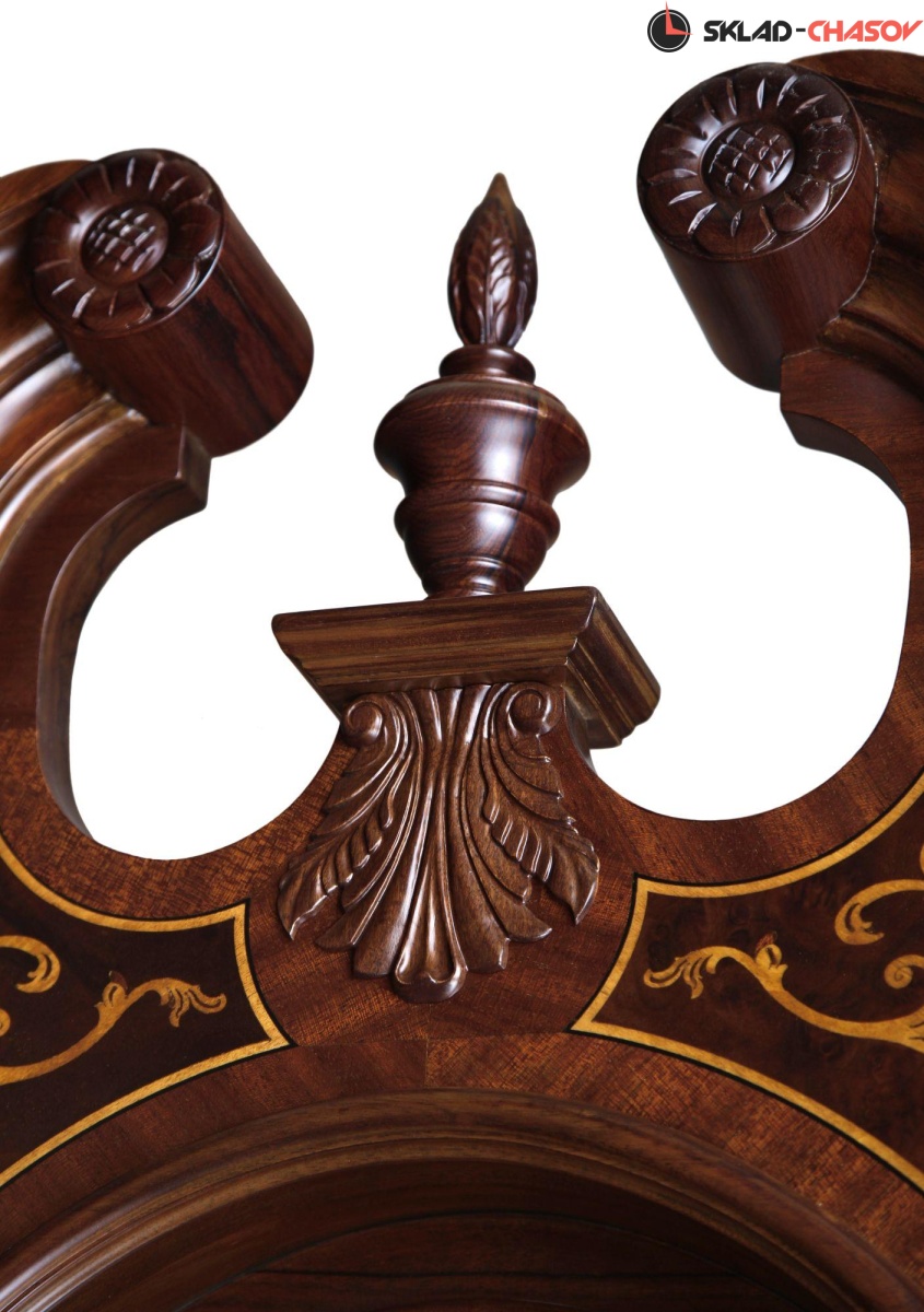 Великолепное мощное основание часов украшают резные молдинги и обрамляют декоративные резные элементы в виде цветов.