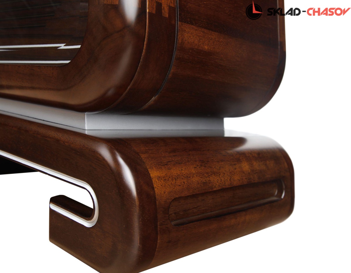 Механические напольные часы в оригинальном корпусе. Корпус выполнен из массива твердых пород дерева и частично покрыт шпоном. Тонировка корпуса выполнена в цвете "орех".