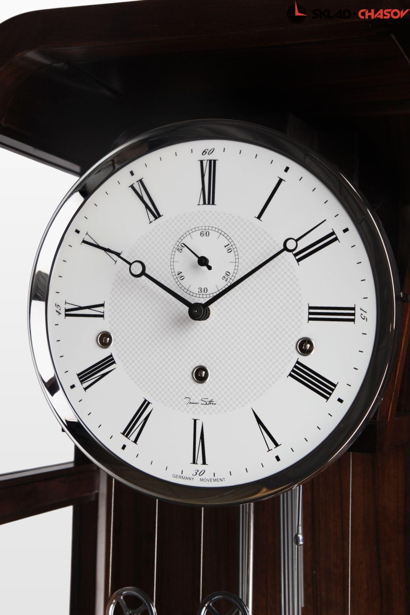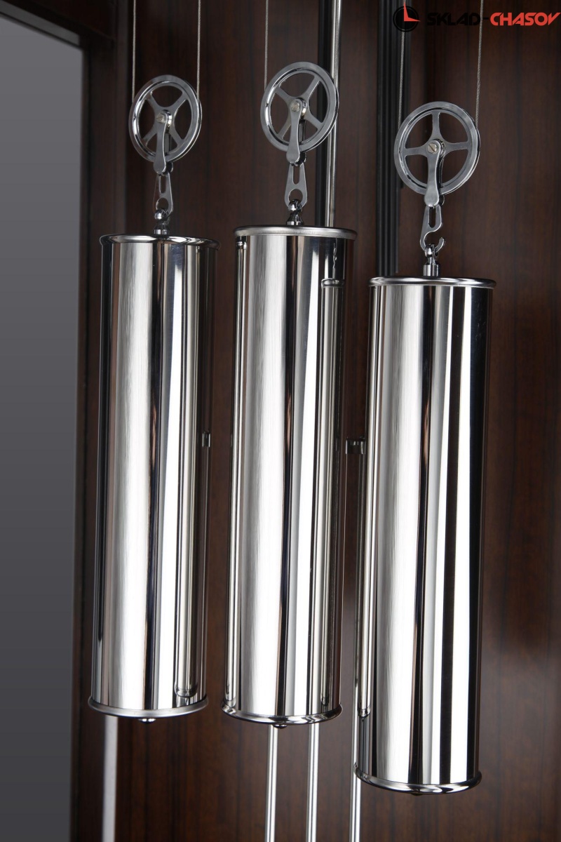 В часах установлен механизм Hermle (Германия) W1161 с тросовым подвесом гирь.