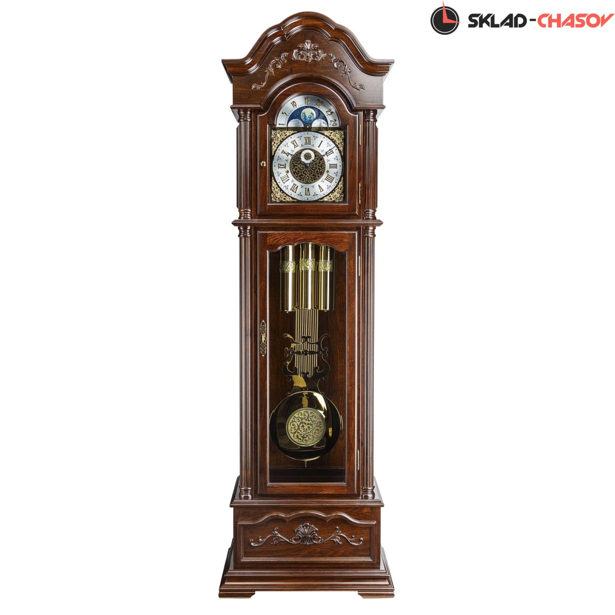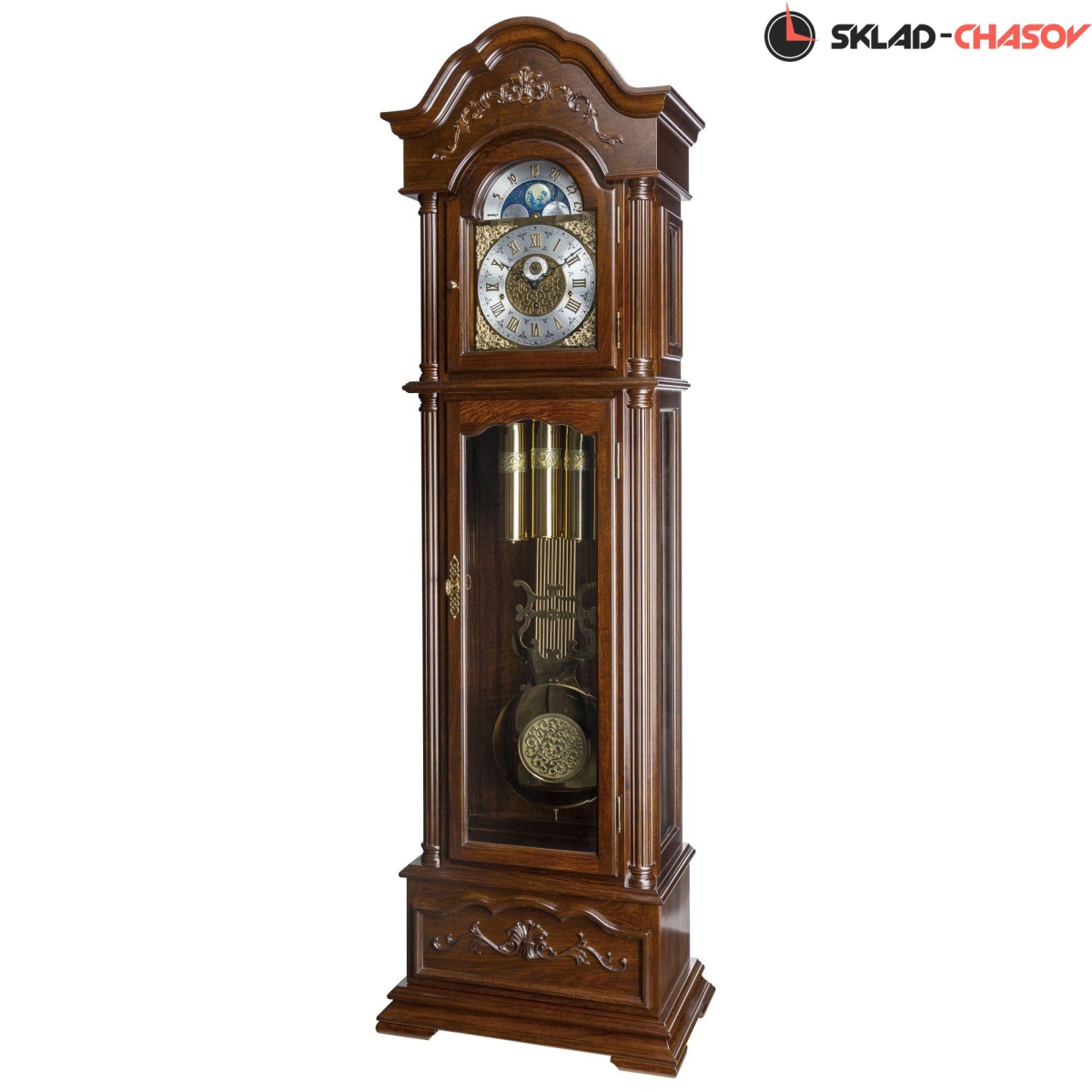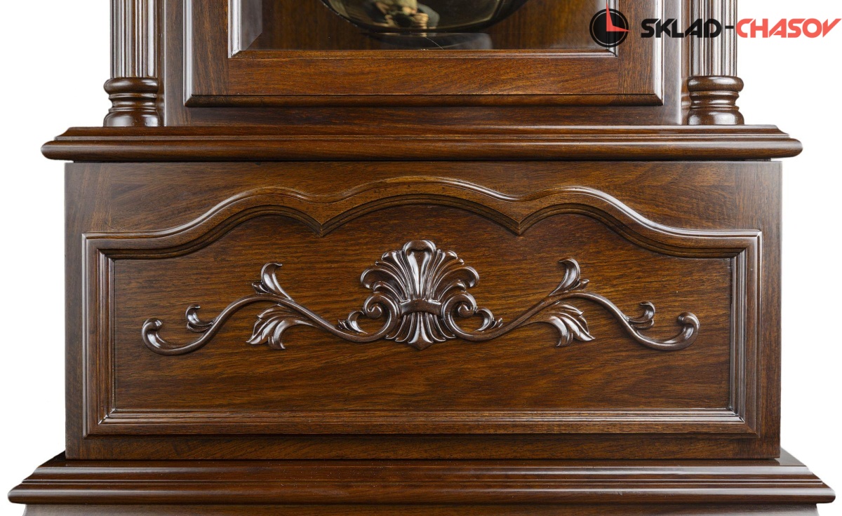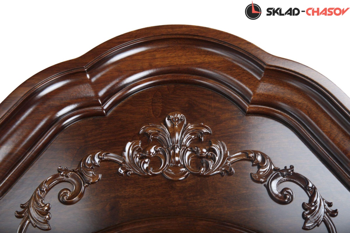 Механические напольные часы в классическом корпусе. Корпус выполнен из массива красного дерева и частично покрыт шпоном. Тонировка корпуса выполнена в цвете "орех".