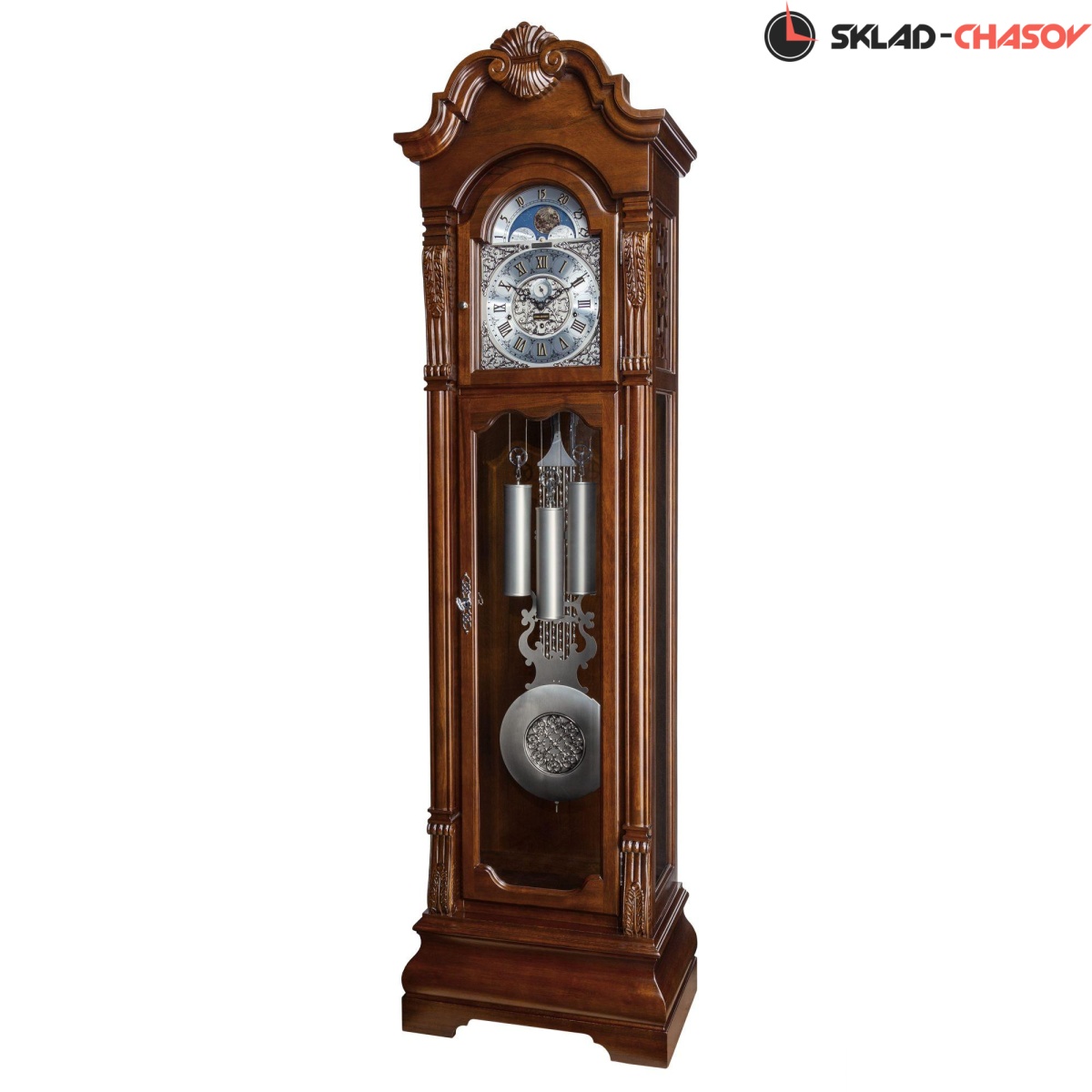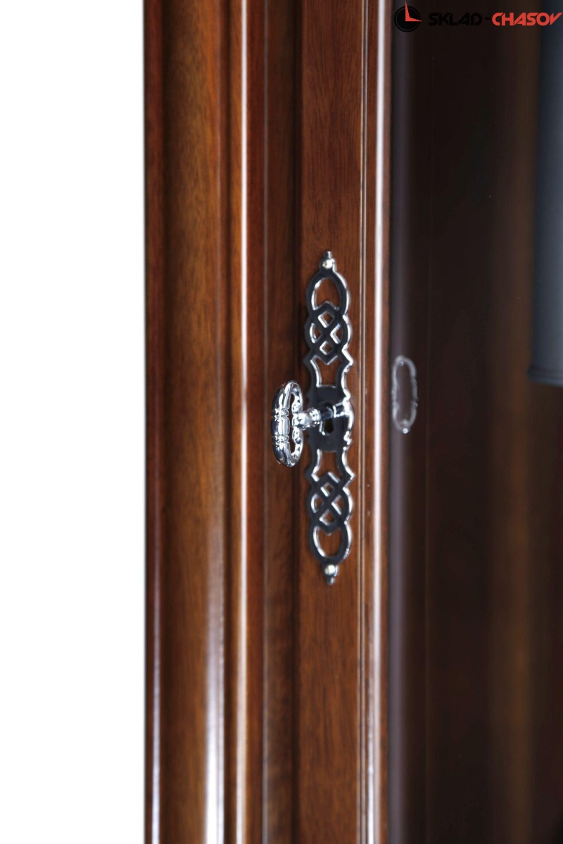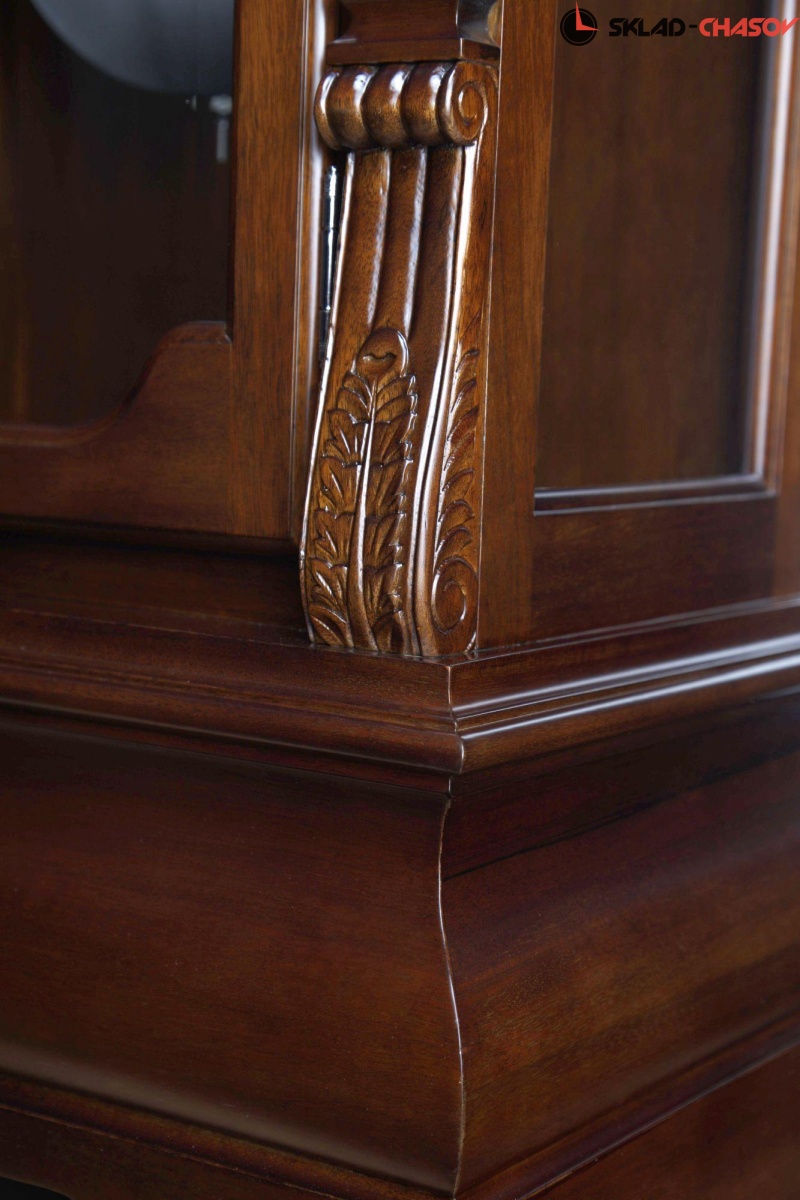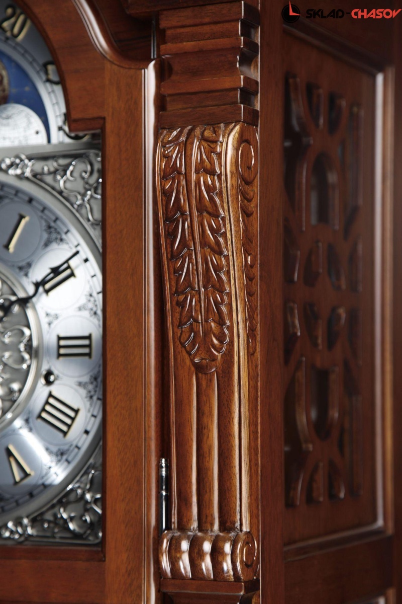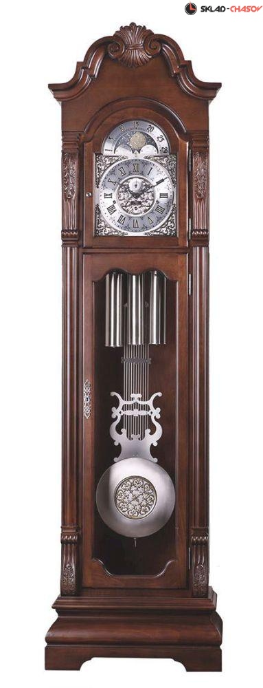 Механические напольные часы в классическом корпусе. Корпус выполнен из массива твердых пород дерева и частично покрыт шпоном. Тонировка выполнена в цвете "орех".