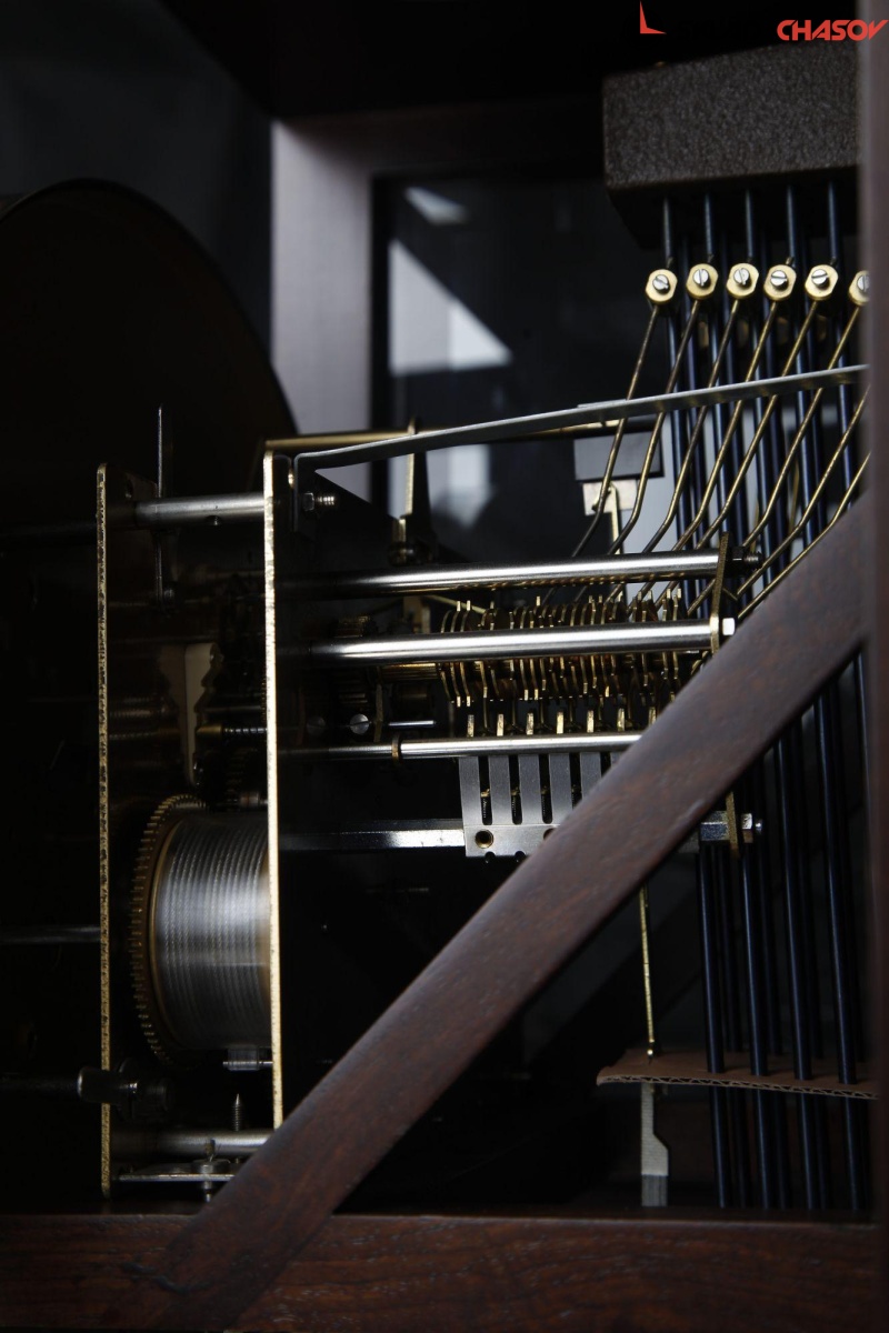 В часах установлен механизм Hermle (Германия) W1161 с тросовым подвесом гирь.