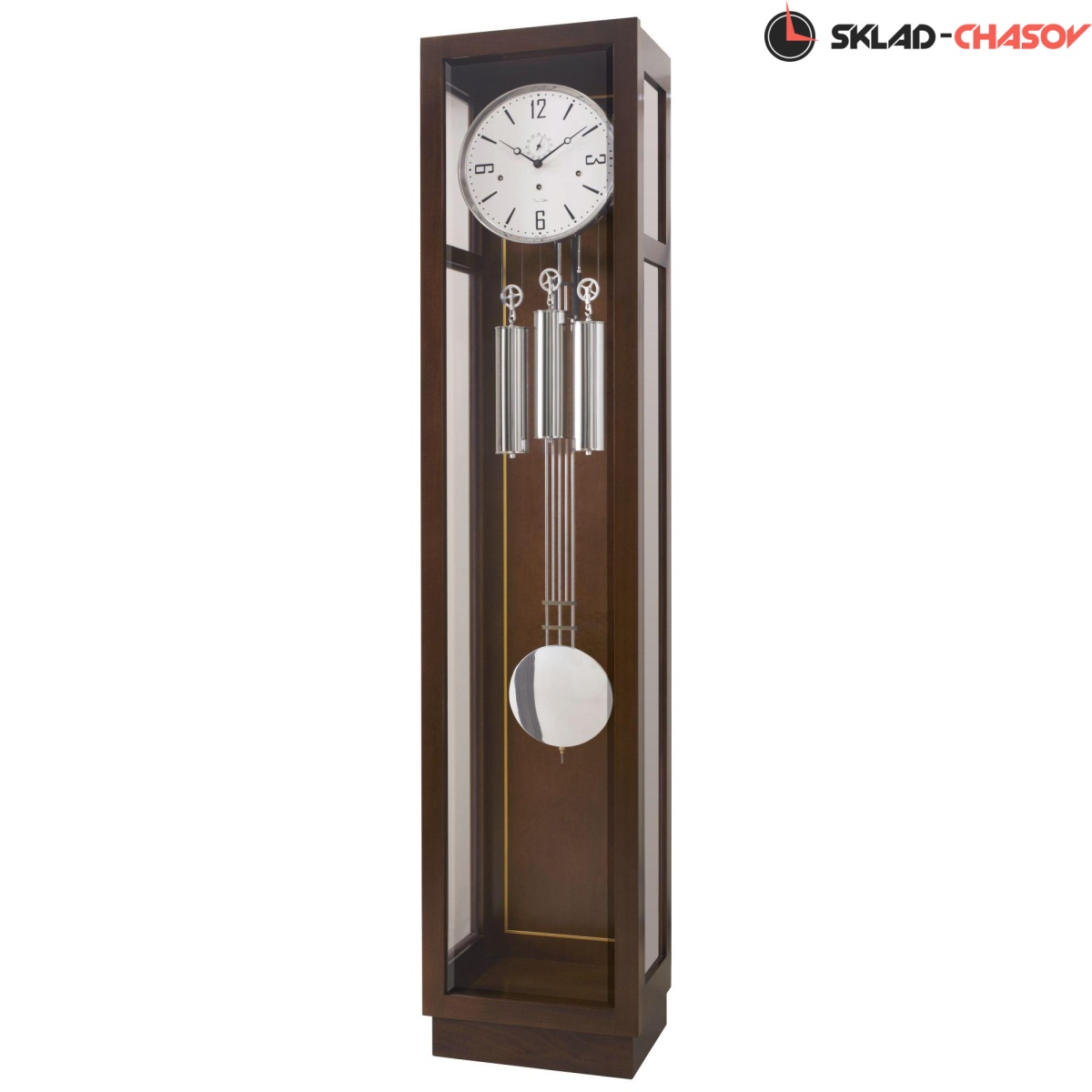 Механические напольные часы в современном корпусе. Корпус выполнен из массива твердых пород дерева и частично покрыт шпоном. Тонировка корпуса выполнена в цвете "орех".