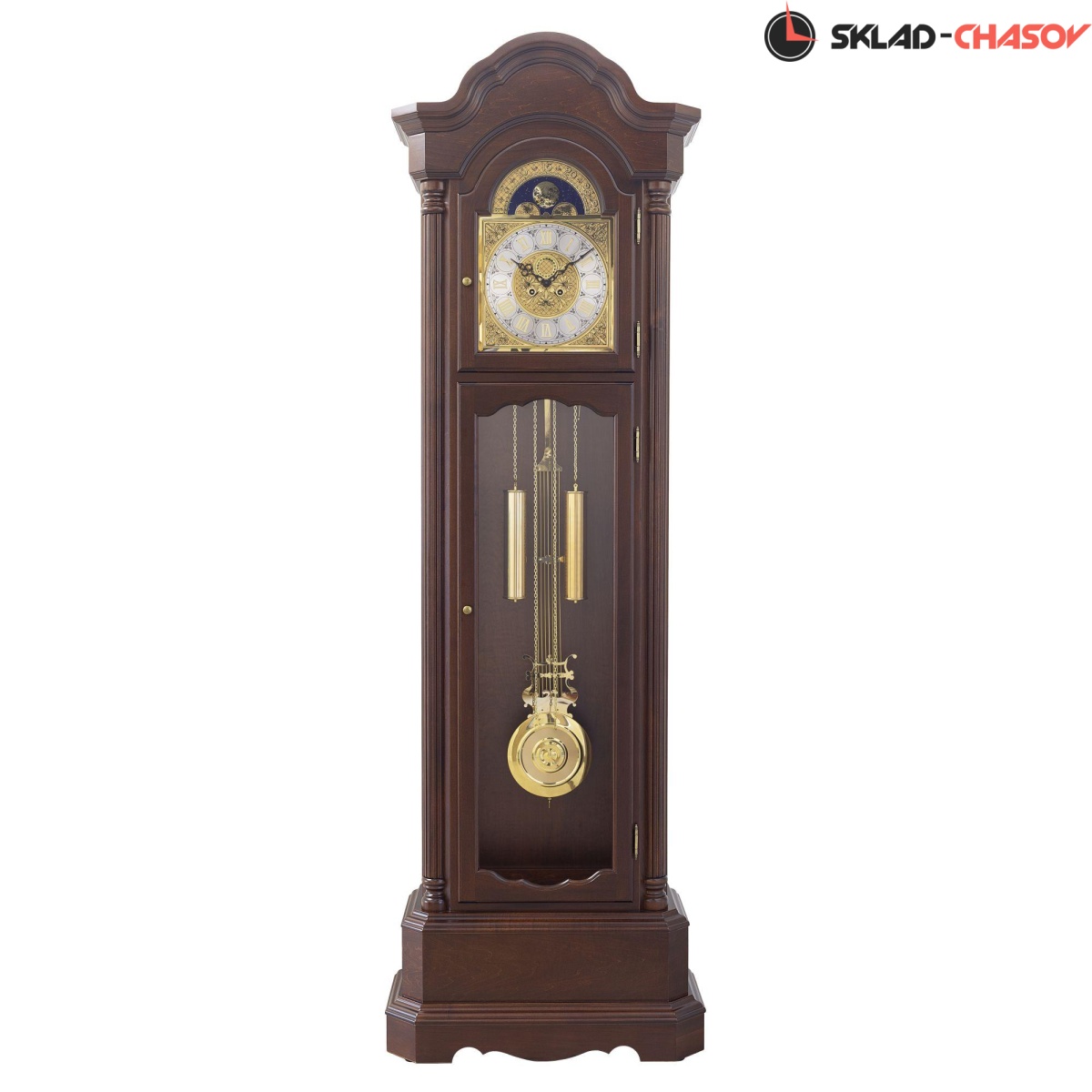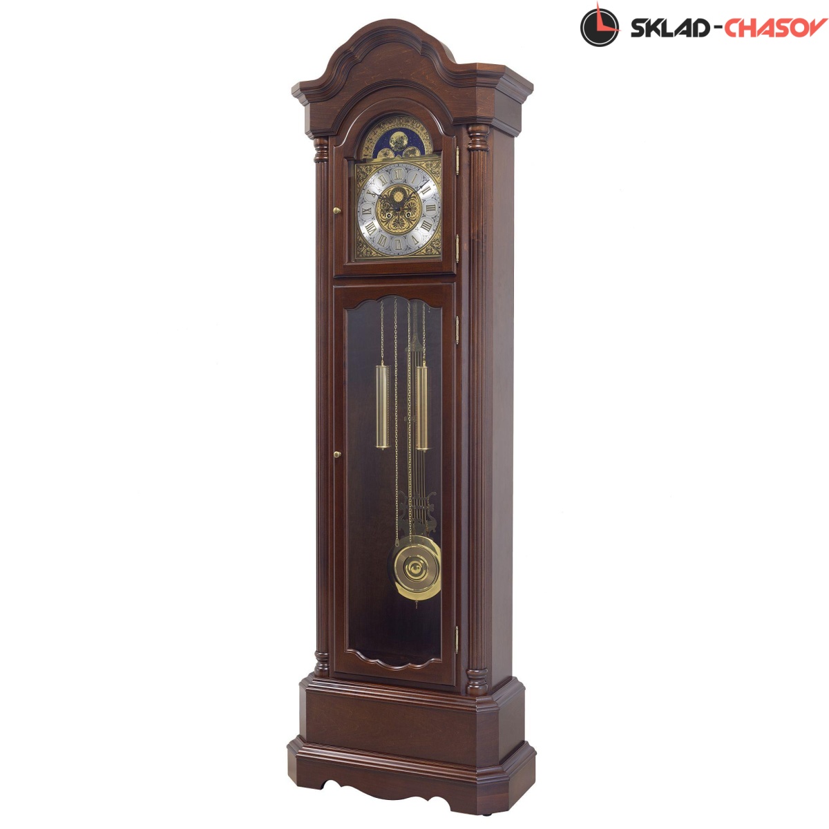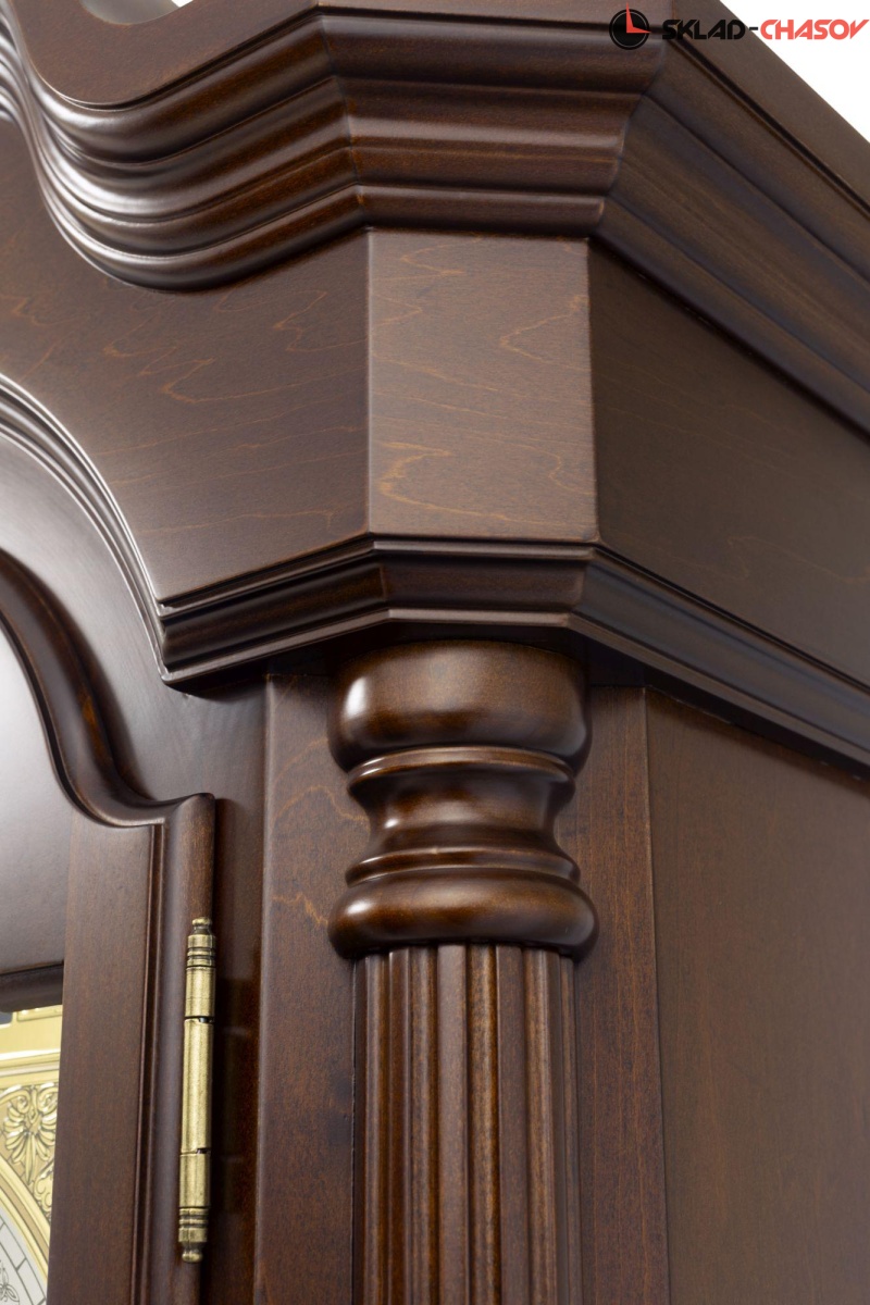 Механические напольные часы в классическом корпусе. Корпус выполнен из массива твердых пород дерева и частично покрыт шпоном. Тонировка корпуса выполнена в цвете "орех".