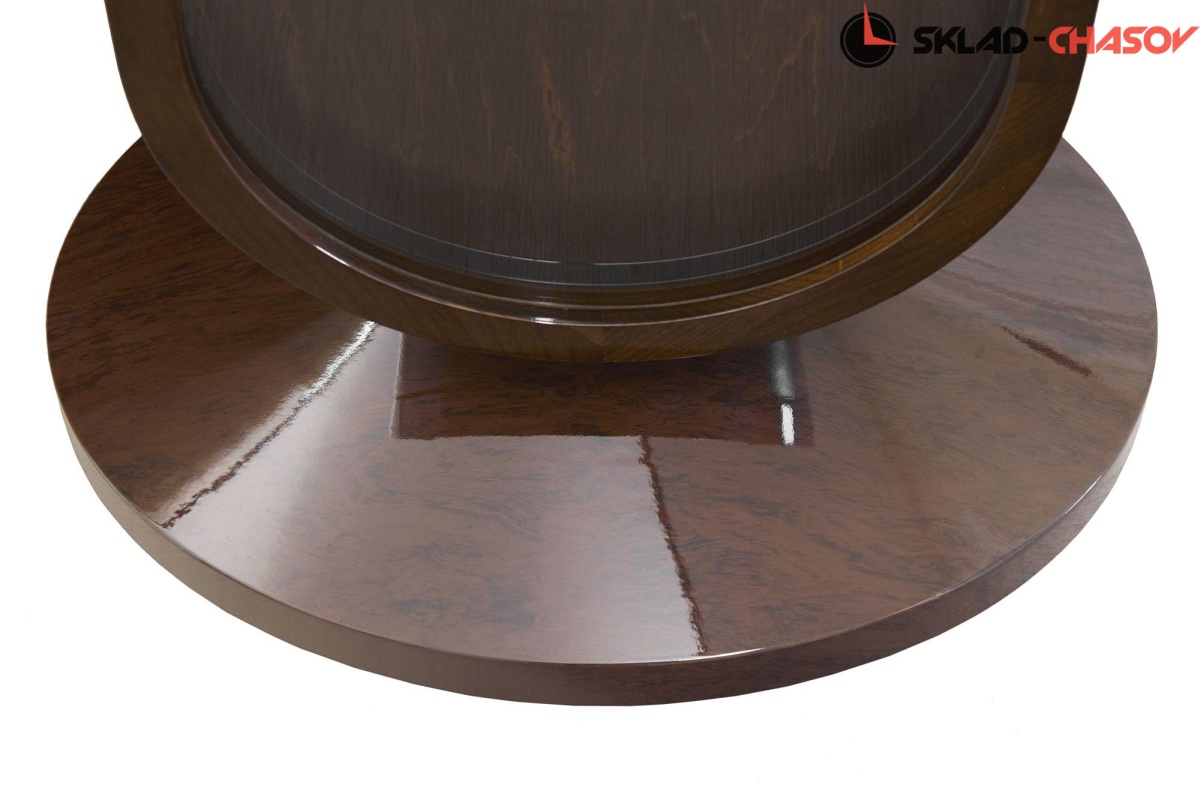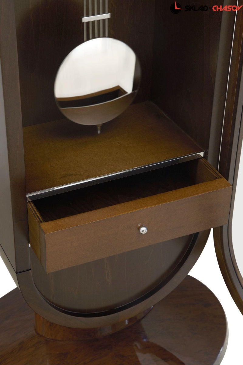 Механические напольные часы в оригинальном современном корпусе. Корпус выполнен из массива твердых пород дерева и частично покрыт шпоном. Тонировка корпуса выполнена в цвете "орех".