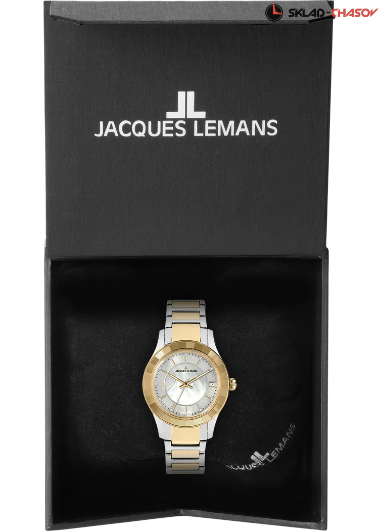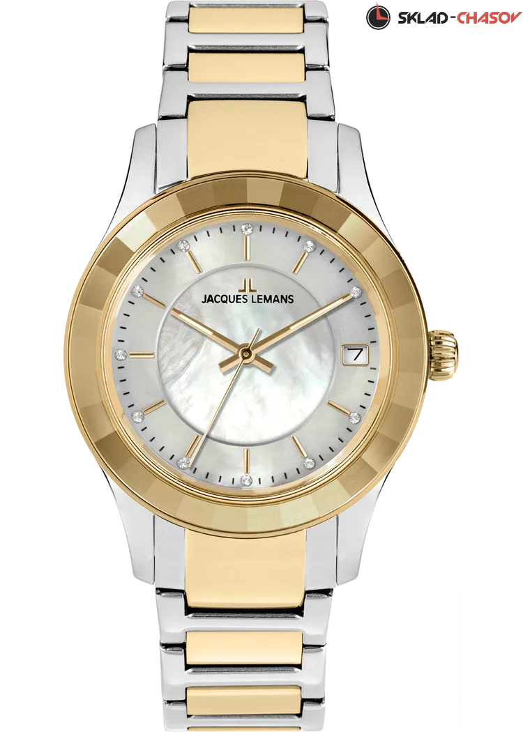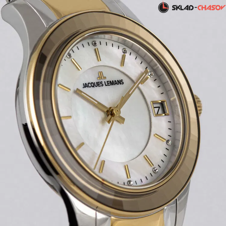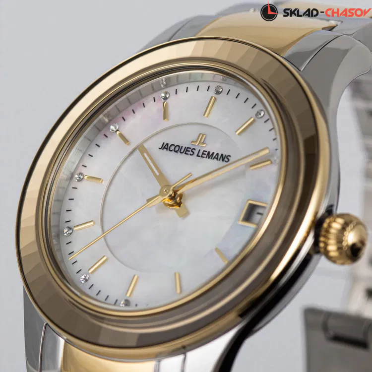 Объемный циферблат из натурального перламутра — прием, который дизайнеры Jacques Lemans используют при выпуске последних серий женских часов и который явно нравится поклонницам бренда. В новой модели кварцевых часов серии 1-2194 его тоже применили, акцентируя таким образом внимание на трех центральных стрелках, часовая и минутная с люминесцентным покрытием. Белый циферблат оснащен и окошком даты на трех часах, оно выделено накладной рамкой. В каждой, отполированной до зеркального блеска риске отражается сияние кристалла Swarovski - на циферблате их ровно двенадцать и, кроме декоративной функции, они помогают определять время. Корпус диаметром 34 мм сделан из нержавеющей стали. Его лаконичность сочетается с роскошью широкого безеля, на гранях которого лучики света играют при любом движении руки. Браслет часов собран из стальных звеньев с PVD-покрытием из желтого золота и удобной в использовании застежки-клипсы с двумя боковыми кнопками. Часы 1-2194 - тот самый аксессуар, который будет уместен независимо от ситуации: и на деловом совещании, на дружеской вечеринке, и во время торжественного выхода в свет.