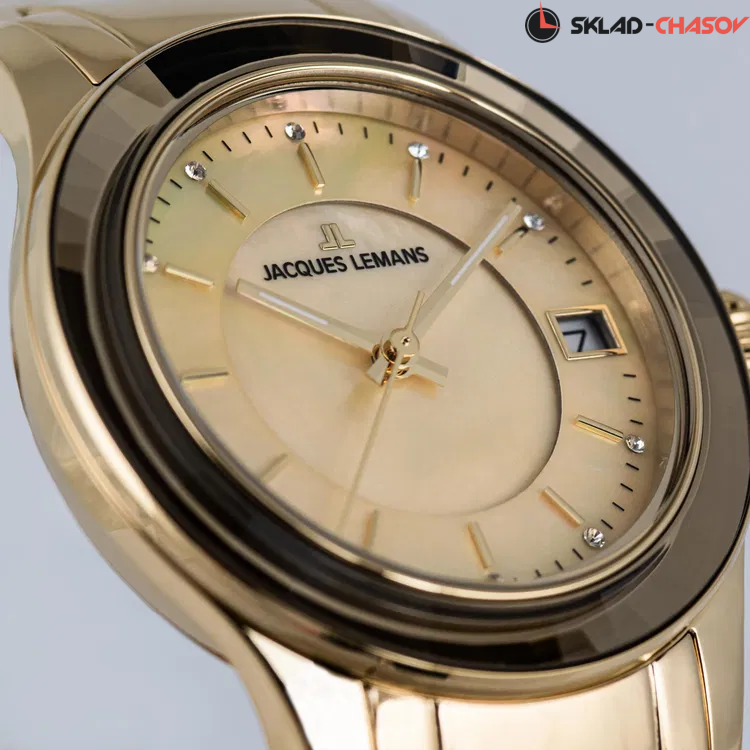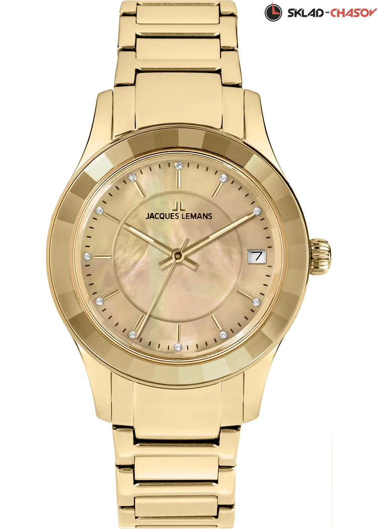 Объемный циферблат из натурального перламутра — прием, который дизайнеры Jacques Lemans используют при выпуске последних серий женских часов и который явно нравится поклонницам бренда. В новой модели кварцевых часов серии 1-2194 его тоже применили, акцентируя таким образом внимание на трех центральных стрелках, часовая и минутная с люминесцентным покрытием. Циферблат цвета желтого золота оснащен окошком даты на трех часах, оно выделено накладной рамкой. В каждой, отполированной до зеркального блеска риске отражается сияние кристалла Swarovski - на циферблате их ровно двенадцать и, кроме декоративной функции, они помогают определять время. Корпус диаметром 34 мм сделан из нержавеющей стали с PVD-покрытием из желтого золота. Его лаконичность сочетается с роскошью широкого безеля, на гранях которого лучики света играют при любом движении руки. Браслет часов собран из стальных звеньев с PVD-покрытием из желтого золота и удобной в использовании застежки-клипсы с двумя боковыми кнопками. Часы 1-2194 - тот самый аксессуар, который будет уместен независимо от ситуации: и на деловом совещании, на дружеской вечеринке, и во время торжественного выхода в свет.