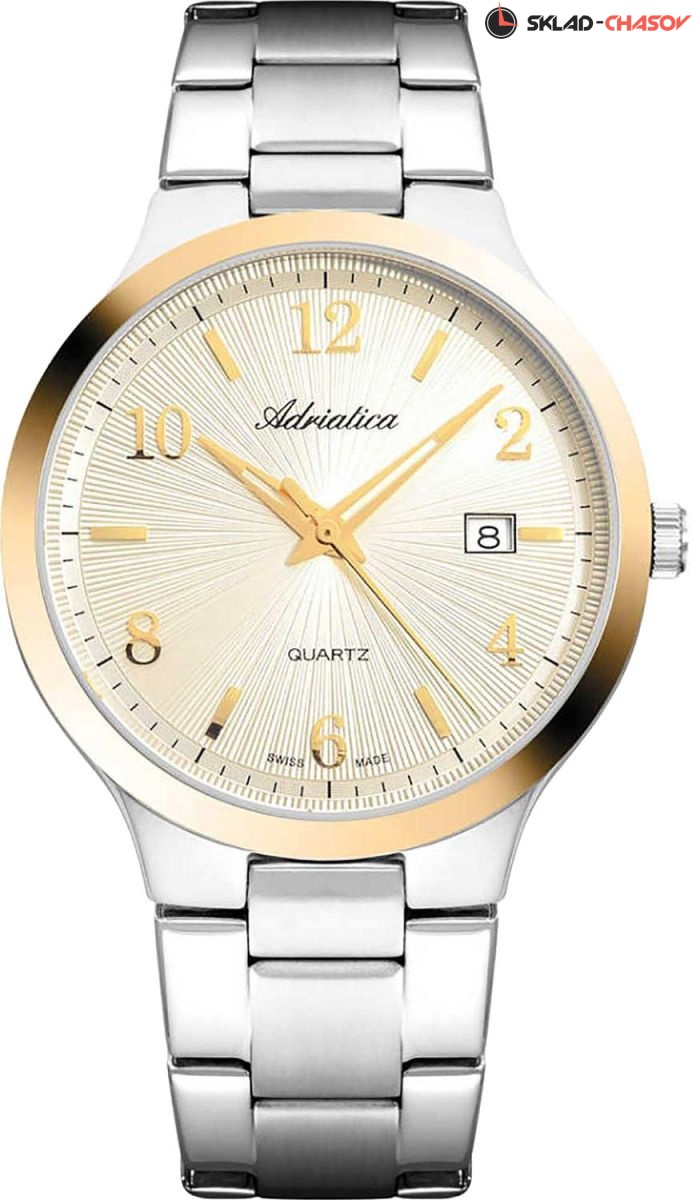 Стильные мужские наручные часы Adriatica. Присутствует апертура даты. Точность хода обеспечивает швейцарский кварцевый механизм Ronda. Браслет с раскладывающейся застежкой.Гарантия 2 года.