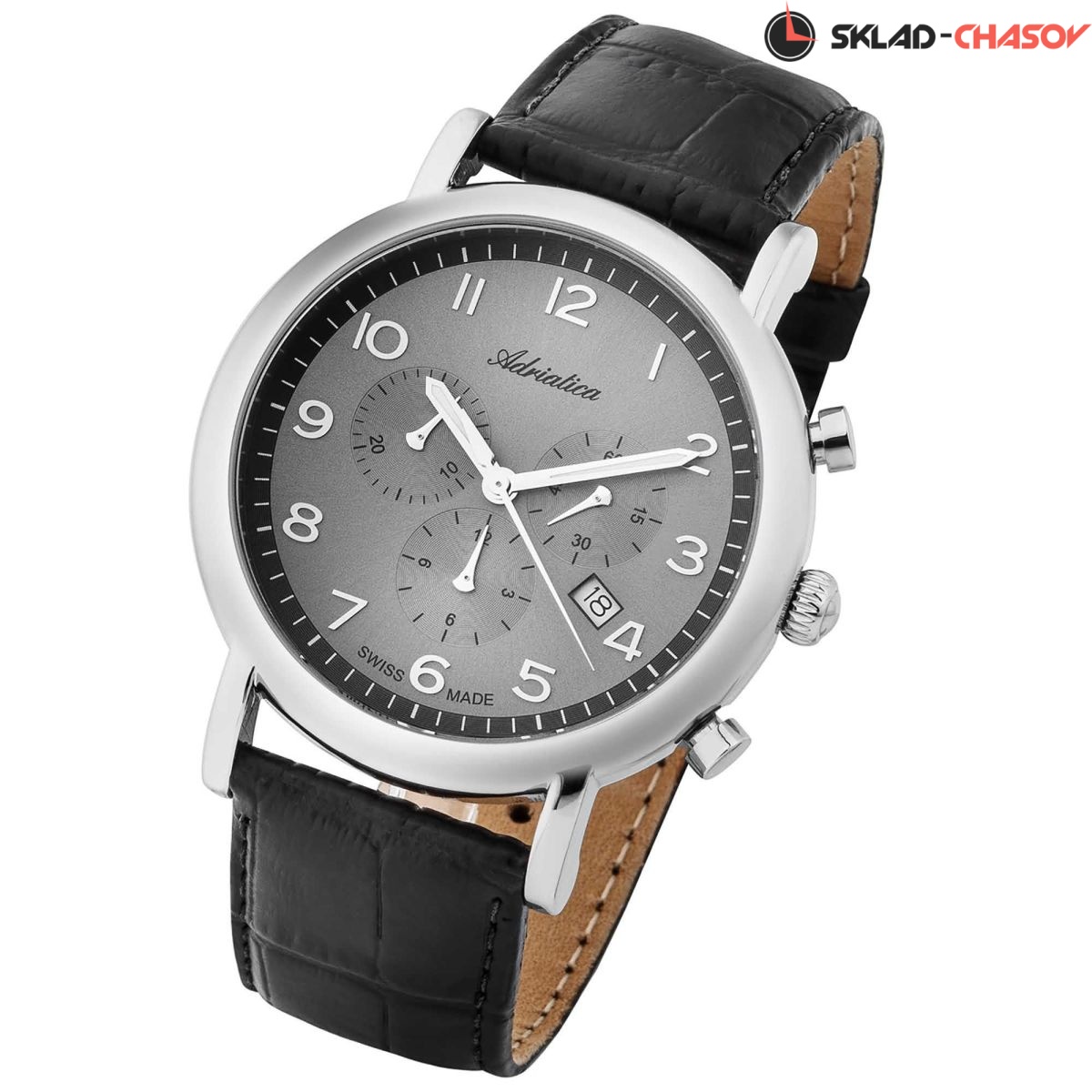 Мужские наручные часы-хронограф с секундомером. На отдельном циферблате отображается текущее время в 24-х часовом формате. Присутствует апертура текущего числа. Циферблат закрывает устойчивое к царапинам сапфировое стекло. Ремешок из натуральной кожи с классической застежкой. Точность хода обеспечивает швейцарский кварцевый механизм Ronda 5030. Вес 65 грамм. Гарантия 2 года.