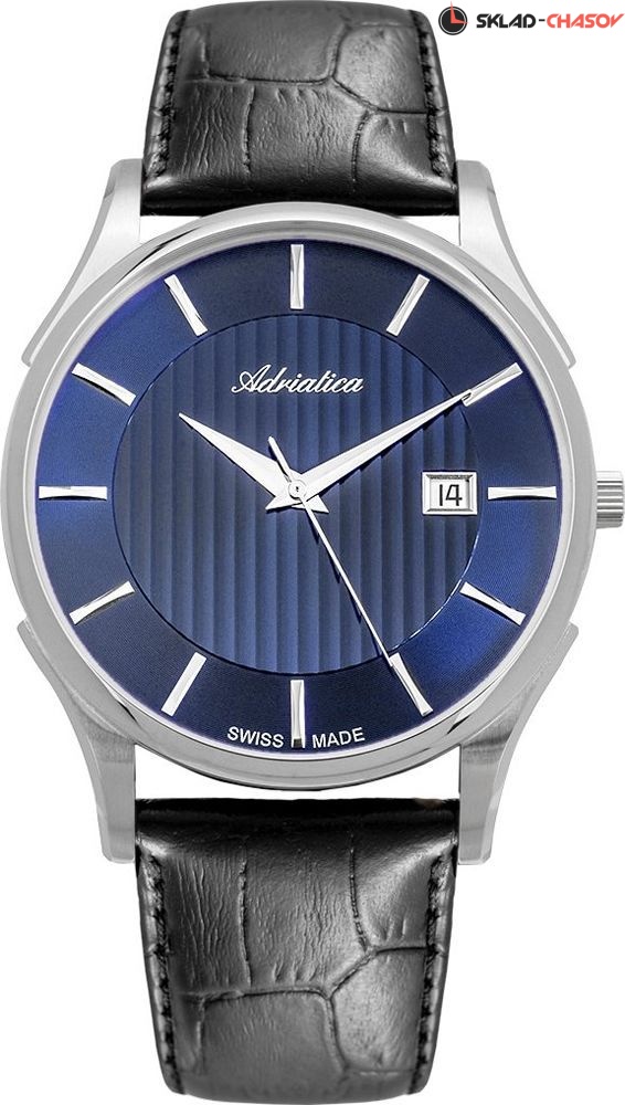 Классические мужские часы от швейцарского бренда Adriatica. На циферблате присутствует апертура текущей даты. Ремешок из натуральной кожи с классической застежкой. Точность хода обеспечивает швейцарский кварцевый механизм ETA F06. Вес часов 54 грамма. Гарантия 2 года.