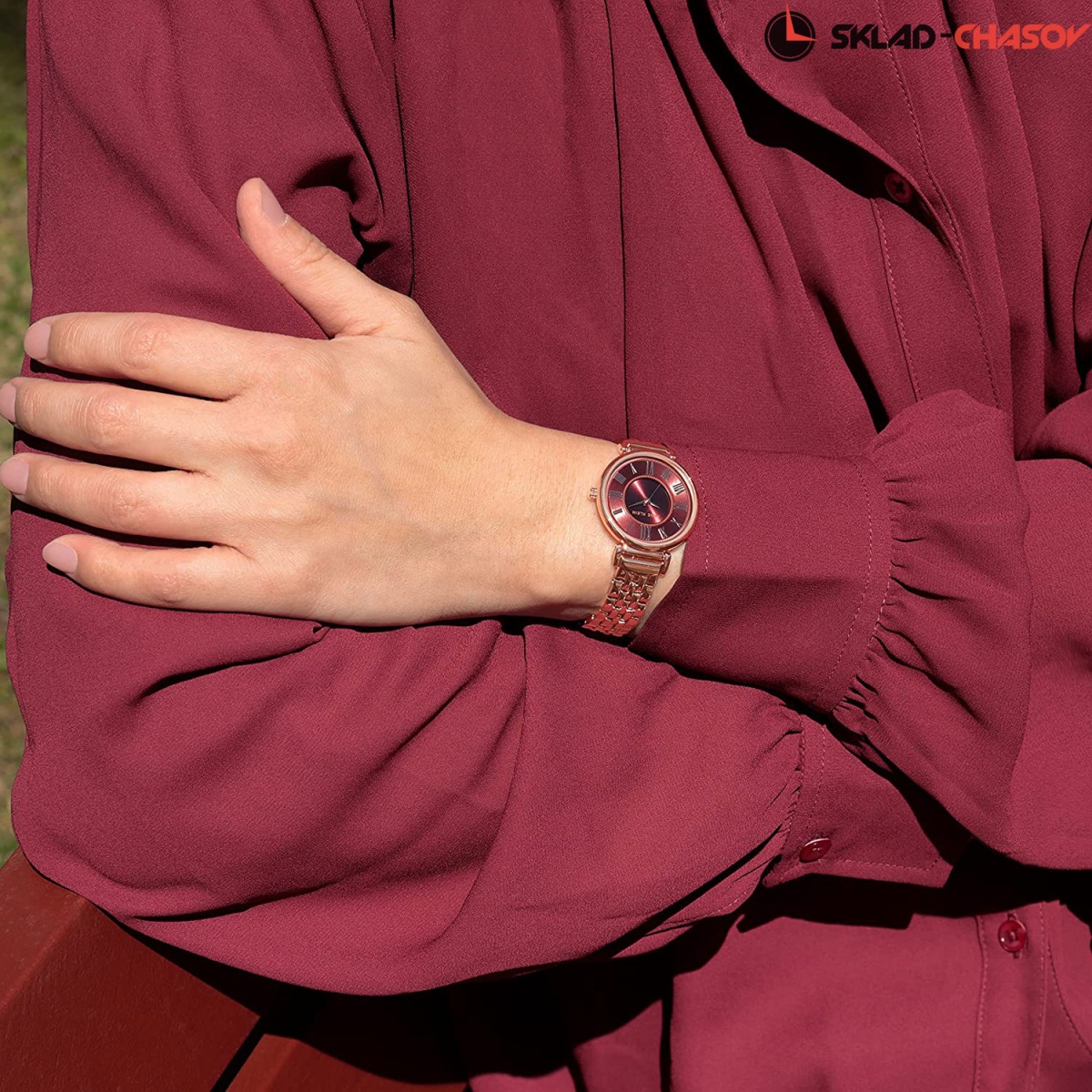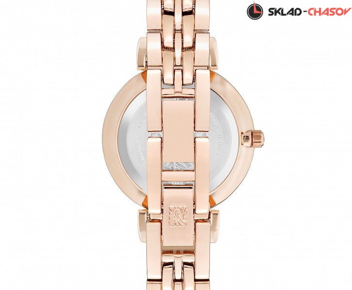 Циферблат с небольшими стрелками в центральной части выполнен по технологии Sunray (солнечные лучи) и украшен в зоне меток рельефным декоративным концентрическим узором. Метки в виде римских цифр. Рифленая заводная головка. Браслет с ювелирной застежкой.