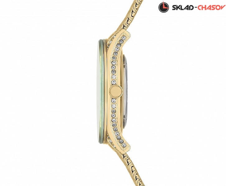 Оригинальная модель часов с необычным браслетом покорит сердце даже самой нестандартно мыслящей красавицы. Daily. Круглый металлический корпус украшен сверху и по бокам кристаллами Swarovski. Циферблат украшен перламутром. Метки в виде соединенных вместе точек (кристаллы Swarovski), штрихов и римских цифр. Рифленая заводная головка. Ювелирная застежка.