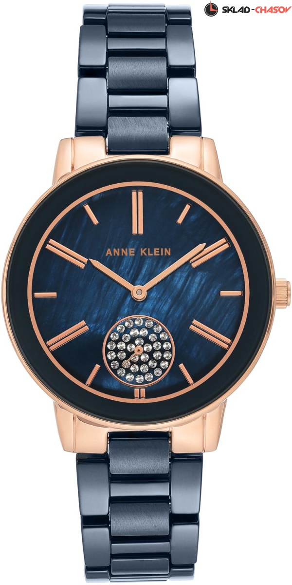 Стильное и интригующее сочетание материалов придаст вашему образу неповторимости и привлекательности. Ceramics. Круглый корпус. Перламутровый синий циферблат с кристаллами Сваровски. Секундная стрелка вынесена на отдельный циферблат. Регулируемая длина браслета.