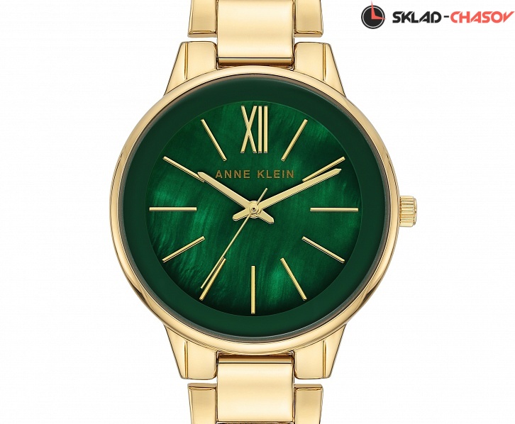 Женские наручные кварцевые часы в круглом металлическом корпусе с минеральным стеклом. Циферблат украшен красивым перламутром с фирменным логотипом Anne Klein в положении 12 часов. Метки в виде штрихов и римских цифр. Рифленая заводная головка. Браслет с ювелирной застежкой.