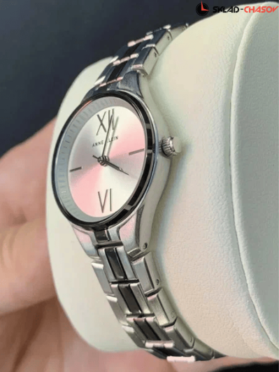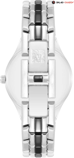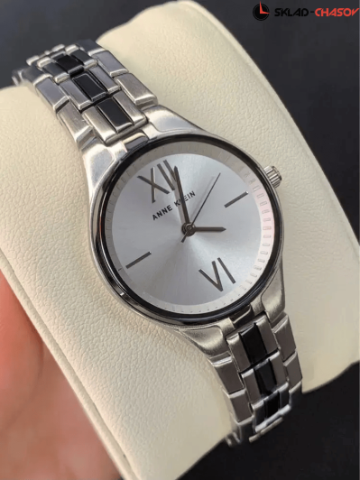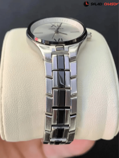 Серебристый циферблат с часовыми индексами в виде штрихов и цифр.