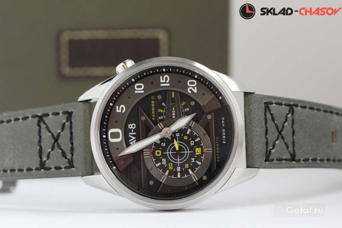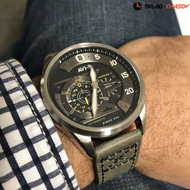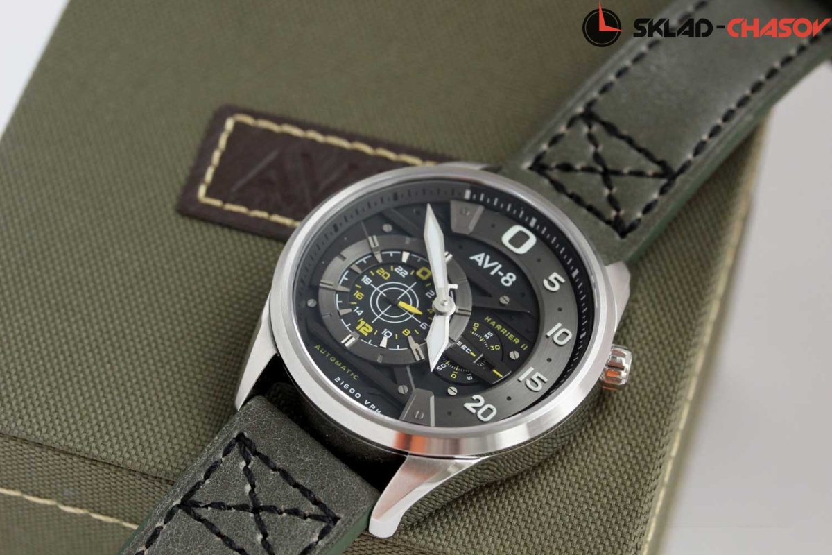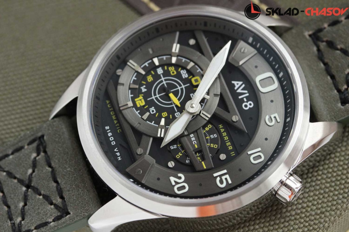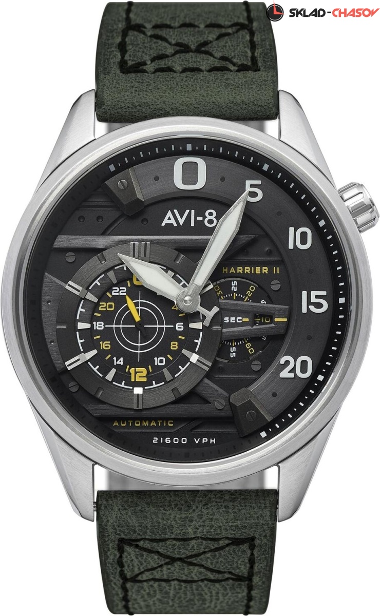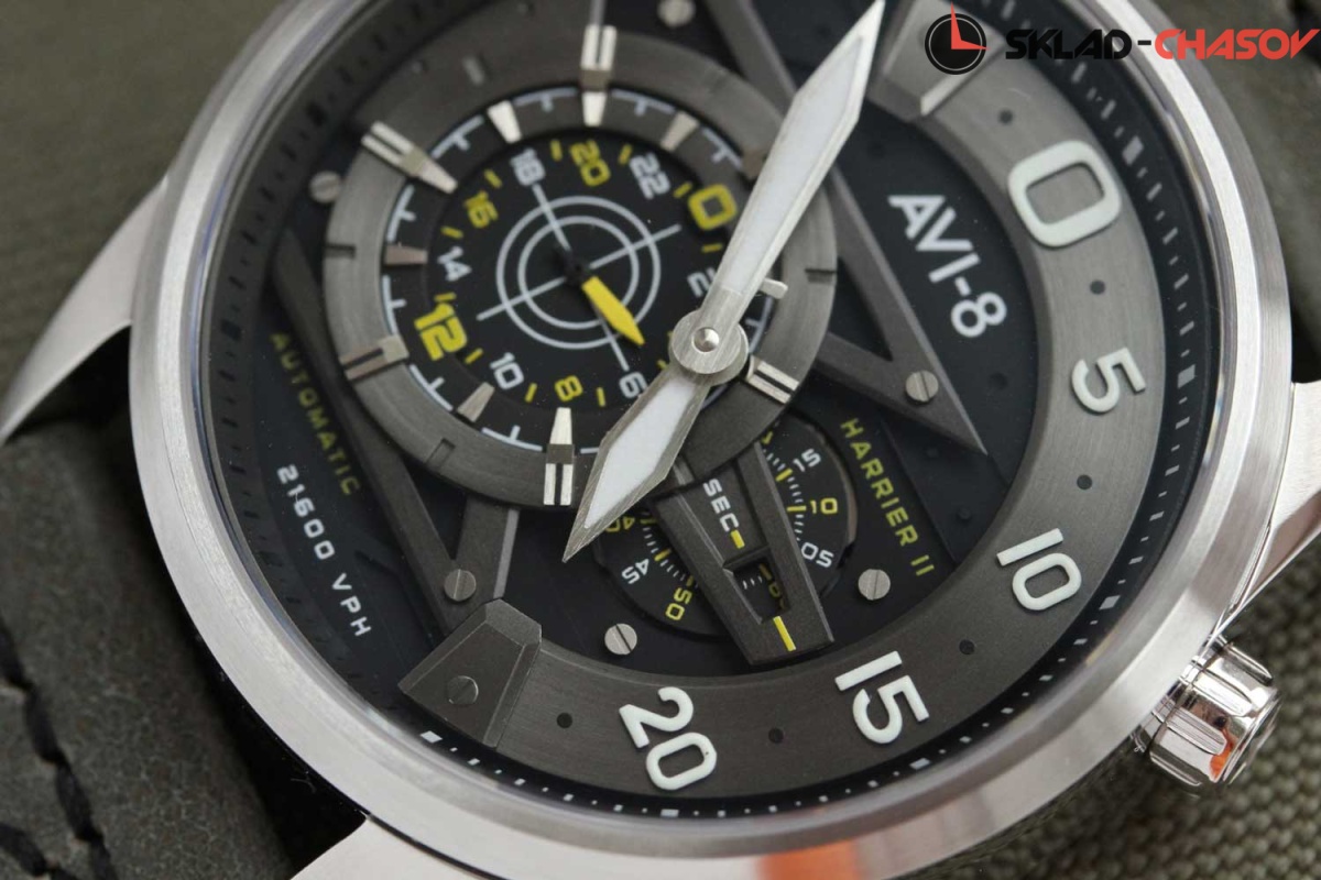 Функциональные авиационные часы серии Hawker Harrier посвящены семейству британских истребителей-бомбардировщиков Harrier, которые стали первыми в мире серийными самолётами с вертикальным взлётом и посадкой. Hawker Harrier II. В механизме 21 камень, частота 21600 полуколебаний в час. 12-ти и 24-х часовой формат времени. На вращающемся диске указатель секунд. Прозрачная задняя крышка. Ротор механизма выполнен в виде лопастей турбин двигателя истребителя Harrier II. Разметка минут повторяет движение реактивного сопла самолета.