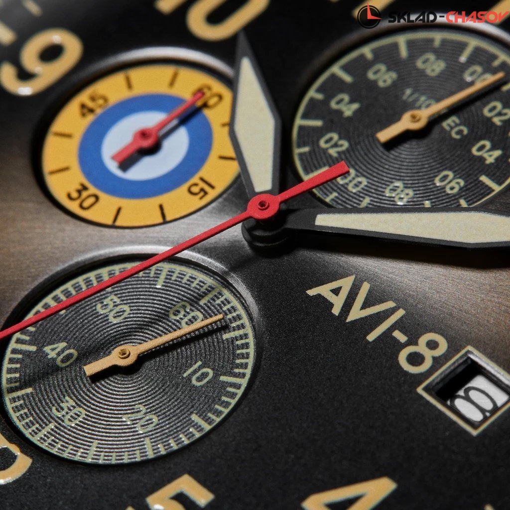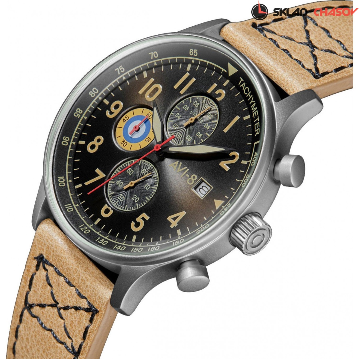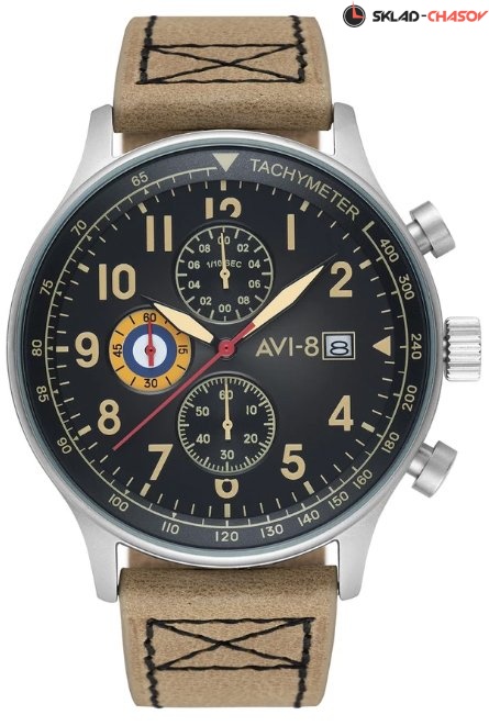 Серия кварцевых часов AVI-8 была названа в честь Hawker Hurricane — одноместного истребителя времен Второй мировой. Дизайн хронографов воплощает эстетику винтажных авиационных часов. Корпус сделан из нержавеющей стали с матированием. На широком циферблате, напоминающем приборную панель самолета, размещены минутный и секундный накопители, счетчик 1/10 секунд, окошко даты. Часовая, минутная стрелки, риски и арабские цифры покрыты специальным составом, который позволяет определить время даже в темноте. Предусмотрена тахиметрическая шкала. Кнопки хронографа по форме напоминают поршни — элементы авиационного двигателя. Рельефная заводная головка украшена объемной эмблемой RAF. На задней крышке модели - гравировка в виде силуэта знаменитого истребителя, который состоял на вооружении ВВС Великобритании с 1934 года. Плотный, искусно состаренный ремешок сделан из натуральной кожи с прошивкой. Часы AVI-8 — не просто функциональный аксессуар, но и дань памяти героям - участникам знаменитых битв Второй мировой войны.