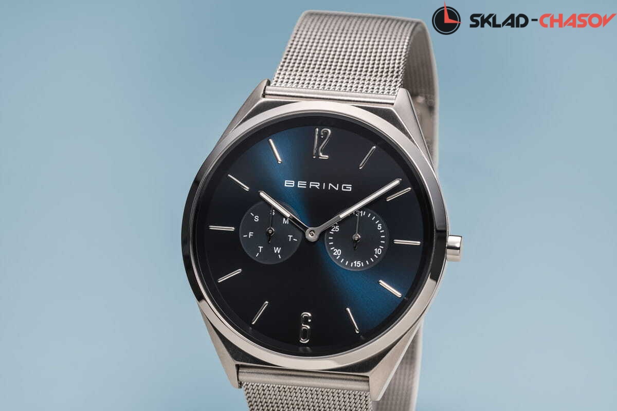 Синий циферблат с гильошированием в виде солнечных лучей.