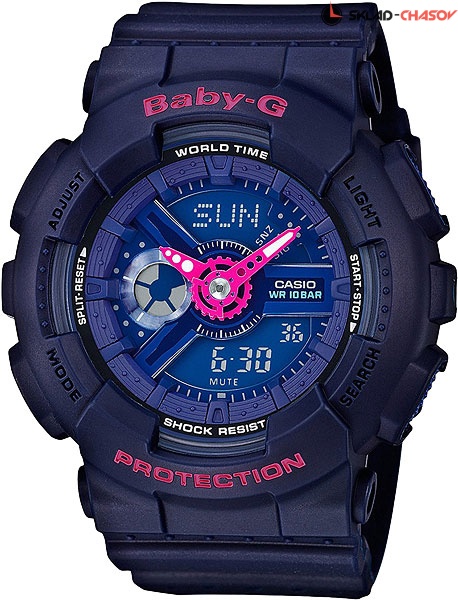 Противоударные часы Baby-G в новом образе. Сочетают в себе стильный внешний вид и технологическое совершенство 21 века. Baby-G Punching Pattern Series. Противоударный корпус защищает механизм от ударов и вибрации. Циферблат подсвечивается светодиодом. Светонакопительное покрытие необрит продолжает светиться в темноте даже после непродолжительного пребывания на свету. Мировое время – 48 городов (29 часовых поясов), всемирное координированное время (UTC). Функция включения/отключения летнего времени. 12-ти и 24-х часовой формат времени. Секундомер с точностью показаний 1/100с и временем измерения 24ч. Сплит-хронограф. Таймер обратного отсчета от 1мин до 24ч. Функция включения/отключения звука.