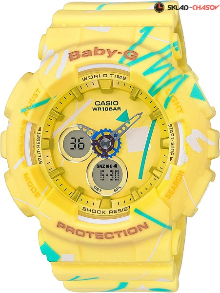 Многофункциональные женские часы оформленные в современном ''граффити'' стиле найдут признание среди девушек, которые любят активный отдых. Baby-G Analog-Digital. Противоударный корпус защищает механизм от ударов и вибрации. Циферблат подсвечивается светодиодом. Мировое время – 27 городов (29 часовых поясов), всемирное координированное время (UTC). Функция включения/отключения летнего времени. 12-ти и 24-х часовой формат времени. Секундомер с точностью показаний 1/100с и временем измерения 1ч. Сплит-хронограф. Таймер обратного отсчета от 1мин до 1ч с автоповтором.