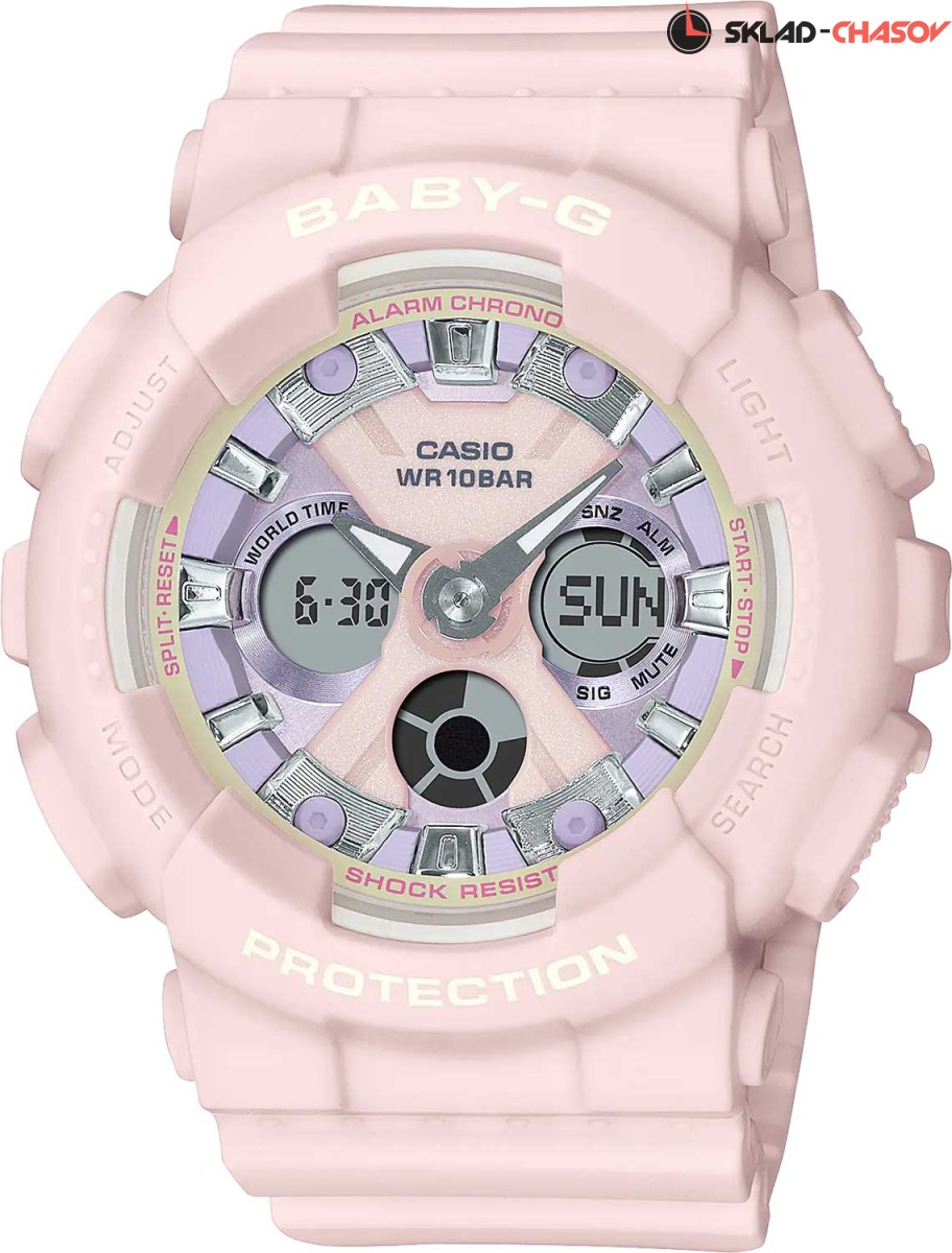 Удобная и функциональная модель часов станет не только спортивным аксессуаром, но и прекрасным украшением. Baby-G. Женские часы. Противоударный корпус защищает механизм от ударов и вибрации. Циферблат подсвечивается светодиодом. Послесвечение. Цвет подсветки: оранжевый. Необритовое светонакопительное покрытие обеспечивает длительное послесвечение в темноте даже после кратковременного нахождения на свету. Система отображения времени. В электронных часах устанавливается нажатием специальной кнопки. В аналоговых – 24-х часовая шкала может быть нанесена на безель, основной или дополнительный циферблат.