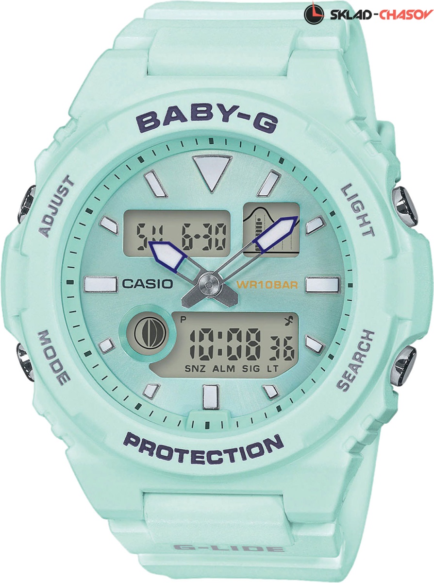 Часы для девушек, которые любят укрощать волну! Они украсят любое запястье и станут частью вашего образа. Baby-G G-Lide. Уникальный дизайн часов в тонком корпусе заимствовал ретро стиль линейки часов G-SHOCK 90-х годов. Противоударный корпус защищает механизм от ударов и вибрации. Необритовое светонакопительное покрытие обеспечивает длительное послесвечение в темноте даже после кратковременного нахождения на свету. Светодиодная автоподсветка - при повороте часов в сторону лица подсветка дисплея осуществляется автоматически. Отображение возраста и фазы Луны. Отображение сведений о приливах и отливах на заданную дату и время даже в режиме хронометража. При каждом нажатии на кнопку напротив 4-х часов можно почасово отследить будущий уровень волны в определенном месте. Секундомер с точностью показаний 1/100с и временем измерения 24ч. Таймер обратного отсчета от 1/1сек до 24ч с автоповтором. Мировое время. 12-ти и 24-х часовой формат времени. Типы сигналов: ежедневный, ежемесячный, каждый день определенного месяца, на определенную дату. Функция отключения/включения звука.