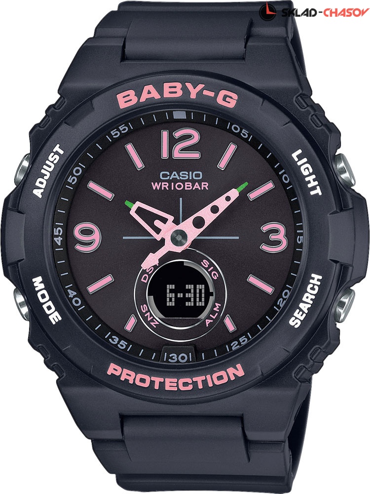Новинки в коллекции Baby-G отлично подойдут для современных и смелых девушек. Baby-G Urban. Новинки в коллекции Baby-G выполнены с винтажными нотками. Неоновые цвета этих часов будут отлично смотреться на различных музыкальных фестивалях и мероприятиях под открытым небом. Противоударный корпус защищает механизм от ударов и вибрации. Циферблат подсвечивается ярким светодиодом. Цвет подсветки: белый. Необритовое светонакопительное покрытие обеспечивает длительное послесвечение в темноте даже после кратковременного нахождения на свету. Мировое время – 27 городов (29 часовых поясов), всемирное координированное время (UTC). Автоматический переход на зимнее и летнее время, возможность включения/отключения данной функции. 12-ти и 24-х часовой формат времени. Секундомер с точностью показаний 1с и временем измерения 1ч. SPLIT-хронограф. Таймер обратного отсчета от 1мин до 1ч с автоповтором. Ремешок из полимерного материала.