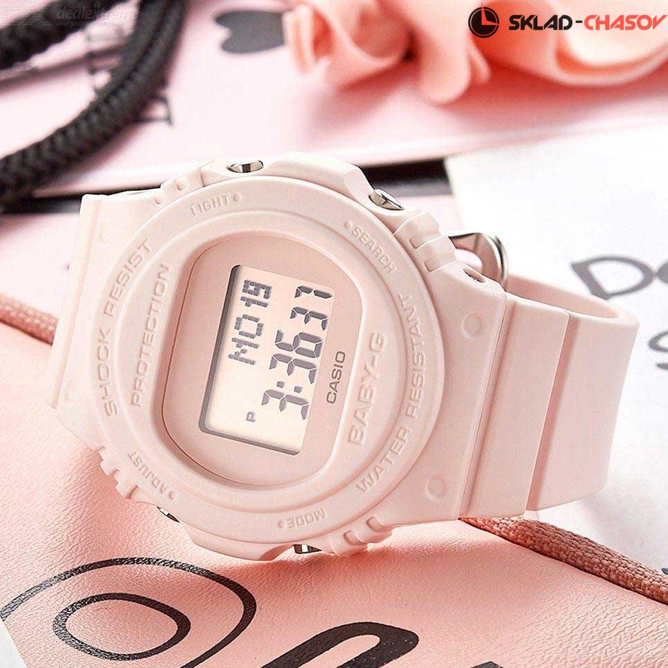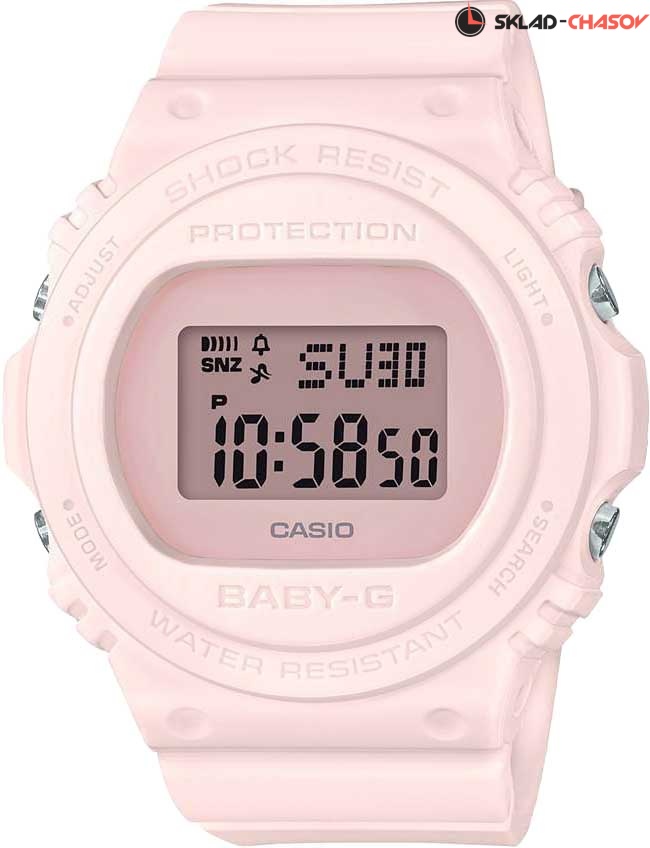 Противоударные часы Baby-G несомненно оценят активные и целеустремленные девушки. Baby-G. Женские часы. Противоударный корпус защищает механизм от ударов и вибрации. Электролюминесцентная подсветка освещает весь циферблат, после отпускания кнопки свечение продолжается еще некоторое время. Настраиваемое послесвечение 1,5 или 3сек. Цвет подсветки: сине-зеленый. 12-ти и 24-х часовой формат времени. Секундомер с точностью показаний 1/100с и временем измерения 1ч. SPLIT-хронограф. Таймер обратного отсчета от 1мин до 24ч. Мировое время – 48 городов (29 часовых поясов). Функции включения/отключения летнего времени и включения/отключения звука. Батарея рассчитана на 3 года. Стальная задняя крышка крепится на 4-х винтах. Ремешок с классической застежкой.