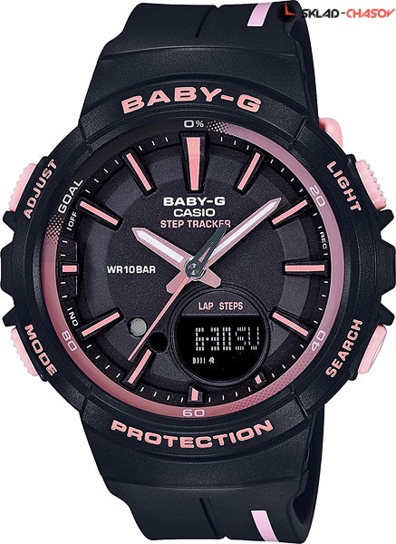 Наручные часы Baby-G Step Tracker с шагомером рассчитаны на женщин, которые занимаются фитнесом, но при этом любят оставаться модными на протяжении всего дня. Baby-G Step Tracker. Противоударный корпус защищает механизм от ударов и вибрации. Яркая двойная светодиодная подсветка обеспечивает освещение не только ЖК-дисплея, но и всего циферблата. Светонакопительное покрытие необрит продолжает светиться в темноте даже после непродолжительного пребывания на свету. Шагомер измеряет количество шагов от 0 до 999999. Графическое отображение пройденных шагов за последние 5ч. История ежедневных данных за 8 дней, еженедельных данных за 4 недели. Установка цели в диапазоне от 1000 до 50 000. Звуковое напоминание об отсутствии активности. Светонакопительное покрытие необрит продолжает светиться в темноте даже после непродолжительного пребывания на свету. Второй часовой пояс. 12-ти и 24-х часовой формат времени. Секундомер с двумя точностями показаний: 1/100с (до 1ч) и 1с (после 1ч) и временем измерения 24ч. Таймер обратного отсчета от 1мин до 100мин. Функция перемещения стрелок. Функция включения/отключения звука.