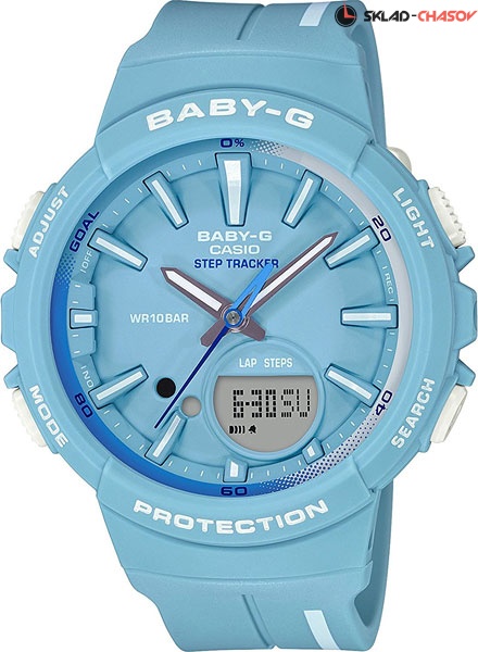 Наручные часы Baby-G Step Tracker с шагомером рассчитаны на женщин, которые занимаются фитнесом, но при этом любят оставаться модными на протяжении всего дня. Baby-G Step Tracker. Противоударный корпус защищает механизм от ударов и вибрации. Яркая двойная светодиодная подсветка обеспечивает освещение не только ЖК-дисплея, но и всего циферблата. Светонакопительное покрытие необрит продолжает светиться в темноте даже после непродолжительного пребывания на свету. Шагомер измеряет количество шагов от 0 до 999999. Графическое отображение пройденных шагов за последние 5ч. История ежедневных данных за 8 дней, еженедельных данных за 4 недели. Установка цели в диапазоне от 1000 до 50 000. Звуковое напоминание об отсутствии активности. Светонакопительное покрытие необрит продолжает светиться в темноте даже после непродолжительного пребывания на свету. Второй часовой пояс. 12-ти и 24-х часовой формат времени. Секундомер с двумя точностями показаний: 1/100с (до 1ч) и 1с (после 1ч) и временем измерения 24ч. Таймер обратного отсчета от 1мин до 100мин. Функция перемещения стрелок. Функция включения/отключения звука.