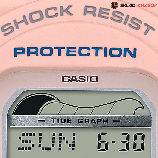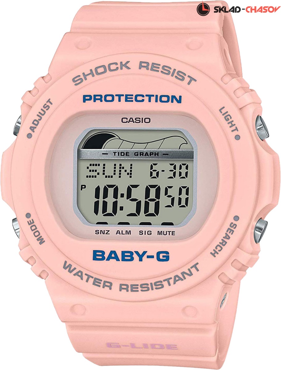 Если вы еще не увлекаетесь серфом, - не беда! Эти часы украсят ваше запястье и будут радовать каждый день, где бы вы не оказались: от скучного офиса, до веселой вечеринки с друзьями! Baby-G G-Lide. Противоударный корпус защищает механизм от ударов и вибрации. Электролюминесцентная подсветка обеспечивает равномерное освещение всего циферблата, облегчая считывание данных. Графическое отображение высоты приливов, сведений о приливах и отливах на заданную дату и время. Мировое время – 48 городов (29 часовых поясов). Автоматический переход на зимнее и летнее время, возможность включения/отключения данной функции. Яхт-таймер используется для отсчета времени до начала регаты, время отсчета может быть задано от 1 до 10 минут, после каждой пройденной минуты издается звуковой сигнал, в течение последних 10 секунд сигнал издается каждую секунду. 12-ти и 24-х часовой формат времени. Секундомер с точностью показаний 1/100с и временем измерения 24ч. Сплит-хронограф. Таймер обратного отсчета от 1мин до 24ч с автоповтором. Типы сигналов: ежедневный, ежемесячный, каждый день определенного месяца, на определенную дату. Световая индикация сигнала. Отображение возраста и фазы Луны. Функция включения/отключения звука.