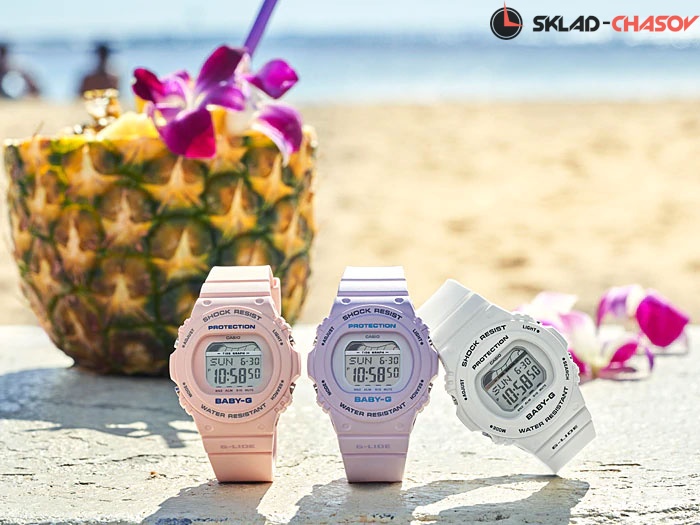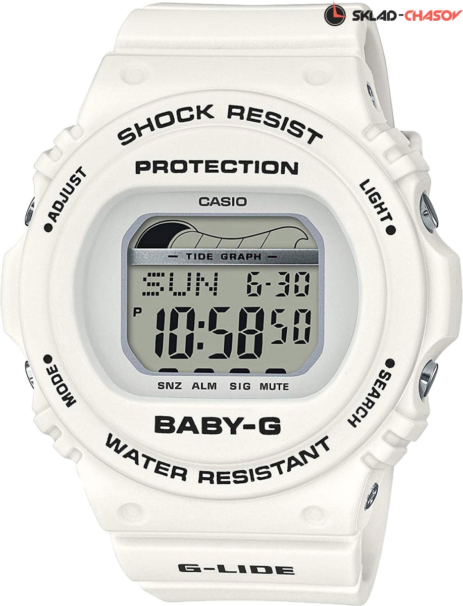 Если вы еще не увлекаетесь серфом, - не беда! Эти часы украсят ваше запястье и будут радовать каждый день, где бы вы не оказались: от скучного офиса, до веселой вечеринки с друзьями! Baby-G G-Lide. Противоударный корпус защищает механизм от ударов и вибрации. Электролюминесцентная подсветка обеспечивает равномерное освещение всего циферблата, облегчая считывание данных. Графическое отображение высоты приливов, сведений о приливах и отливах на заданную дату и время. Мировое время – 48 городов (29 часовых поясов). Автоматический переход на зимнее и летнее время, возможность включения/отключения данной функции. Яхт-таймер используется для отсчета времени до начала регаты, время отсчета может быть задано от 1 до 10 минут, после каждой пройденной минуты издается звуковой сигнал, в течение последних 10 секунд сигнал издается каждую секунду. 12-ти и 24-х часовой формат времени. Секундомер с точностью показаний 1/100с и временем измерения 24ч. Сплит-хронограф. Таймер обратного отсчета от 1мин до 24ч с автоповтором. Типы сигналов: ежедневный, ежемесячный, каждый день определенного месяца, на определенную дату. Световая индикация сигнала. Отображение возраста и фазы Луны. Функция включения/отключения звука.