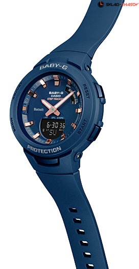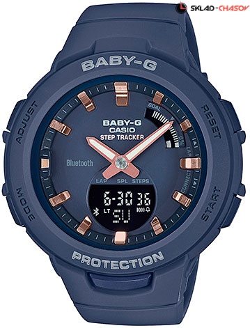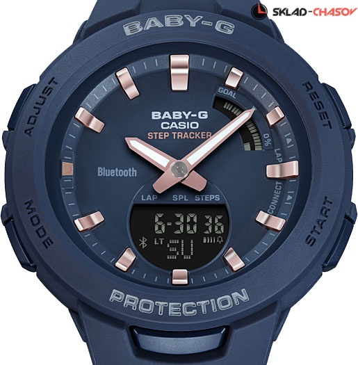 Первые BABY-G с поддержкой соединения Bluetooth и вашего смартфона, выполненные в стильном ярком дизайне, для еще большего удобства при занятиях спортом. G-SQUAD. Противоударный корпус защищает механизм от ударов и вибрации. Двойная подcветка: лицо и циферблат подсвечивается светодиодом, при недостаточном освещении во время поворота запястья подсветка включается автоматически. Светонакопительное покрытие необрит продолжает светиться в темноте даже после непродолжительного пребывания на свету. Шагомер измеряет количество шагов от 0 до 999999. Установка цели в диапазоне от 1000 до 50 000. Графическое отображение пройденных шагов за последние 11ч. Звуковое напоминание об отсутствии активности и достижении цели. Беспроводная технология Bluetooth® 4.0 со сверхнизким потреблением энергии для синхронизации со смартфоном. При подключении к смартфону часы корректируют текущее время, а также копируют настройки мирового времени. Приложение G-SHOCK Connected Phone позволяет настроить параметры для журнала счетчика шагов с пятью уровнями интенсивности упражнений, рассчитать сожженные калории и шаги. Приложение так же позволяет создавать комбинации таймера и отправлять их на часы, хранить данные измерений секундомера. Календарь тренировок с общим измерением интенсивности тренировок, которые разделены на 5 зон для возможности отслеживания уже совершённых и планирования будущих тренировок. Мировое время – 300 городов. Одновременное отображение текущего времени в двух разных часовых поясах. 12-ти и 24-х часовой формат времени. Секундомер с двумя точностями показаний: 1/100с (до 1ч) и 1с (после 1ч) и временем измерения 24ч. Память на 200 этапов (дата, время, время круга). Возможность установить 10 целевых таймеров. Таймер обратного отсчета от 1мин до 1ч с автоповтором. Количество повторений таймера устанавливается от 1 до 20. Функция перемещения стрелок для беспрепятственного просмотра информации на цифровых дисплеях. Функция отключения/включения звука.