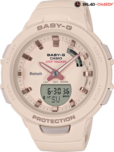 Первые BABY-G с поддержкой соединения Bluetooth и вашего смартфона, выполненные в стильном ярком дизайне, для еще большего удобства при занятиях спортом. G-SQUAD. Противоударный корпус защищает механизм от ударов и вибрации. Двойная подcветка: лицо и циферблат подсвечивается светодиодом, при недостаточном освещении во время поворота запястья подсветка включается автоматически. Светонакопительное покрытие необрит продолжает светиться в темноте даже после непродолжительного пребывания на свету. Шагомер измеряет количество шагов от 0 до 999999. Установка цели в диапазоне от 1000 до 50 000. Графическое отображение пройденных шагов за последние 11ч. Звуковое напоминание об отсутствии активности и достижении цели. Беспроводная технология Bluetooth® 4.0 со сверхнизким потреблением энергии для синхронизации со смартфоном. При подключении к смартфону часы корректируют текущее время, а также копируют настройки мирового времени. Приложение G-SHOCK Connected Phone позволяет настроить параметры для журнала счетчика шагов с пятью уровнями интенсивности упражнений, рассчитать сожженные калории и шаги. Приложение так же позволяет создавать комбинации таймера и отправлять их на часы, хранить данные измерений секундомера. Календарь тренировок с общим измерением интенсивности тренировок, которые разделены на 5 зон для возможности отслеживания уже совершённых и планирования будущих тренировок. Мировое время – 300 городов. Одновременное отображение текущего времени в двух разных часовых поясах. 12-ти и 24-х часовой формат времени. Секундомер с двумя точностями показаний: 1/100с (до 1ч) и 1с (после 1ч) и временем измерения 24ч. Память на 200 этапов (дата, время, время круга). Возможность установить 10 целевых таймеров. Таймер обратного отсчета от 1мин до 1ч с автоповтором. Количество повторений таймера устанавливается от 1 до 20. Функция перемещения стрелок для беспрепятственного просмотра информации на цифровых дисплеях. Функция отключения/включения звука.