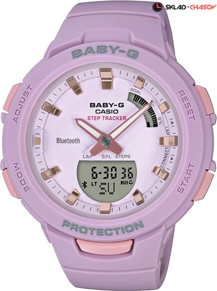 Первые BABY-G с поддержкой соединения Bluetooth и вашего смартфона, выполненные в стильном ярком дизайне, для еще большего удобства при занятиях спортом. G-SQUAD. Противоударный корпус защищает механизм от ударов и вибрации. Двойная подcветка: лицо и циферблат подсвечивается светодиодом, при недостаточном освещении во время поворота запястья подсветка включается автоматически. Светонакопительное покрытие необрит продолжает светиться в темноте даже после непродолжительного пребывания на свету. Шагомер измеряет количество шагов от 0 до 999999. Установка цели в диапазоне от 1000 до 50 000. Графическое отображение пройденных шагов за последние 11ч. Звуковое напоминание об отсутствии активности и достижении цели. Беспроводная технология Bluetooth® 4.0 со сверхнизким потреблением энергии для синхронизации со смартфоном. При подключении к смартфону часы корректируют текущее время, а также копируют настройки мирового времени. Приложение G-SHOCK Connected Phone позволяет настроить параметры для журнала счетчика шагов с пятью уровнями интенсивности упражнений, рассчитать сожженные калории и шаги. Приложение так же позволяет создавать комбинации таймера и отправлять их на часы, хранить данные измерений секундомера. Календарь тренировок с общим измерением интенсивности тренировок, которые разделены на 5 зон для возможности отслеживания уже совершённых и планирования будущих тренировок. Мировое время – 300 городов. Одновременное отображение текущего времени в двух разных часовых поясах. 12-ти и 24-х часовой формат времени. Секундомер с двумя точностями показаний: 1/100с (до 1ч) и 1с (после 1ч) и временем измерения 24ч. Память на 200 этапов (дата, время, время круга). Возможность установить 10 целевых таймеров. Таймер обратного отсчета от 1мин до 1ч с автоповтором. Количество повторений таймера устанавливается от 1 до 20. Функция перемещения стрелок для беспрепятственного просмотра информации на цифровых дисплеях. Функция отключения/включения звука.