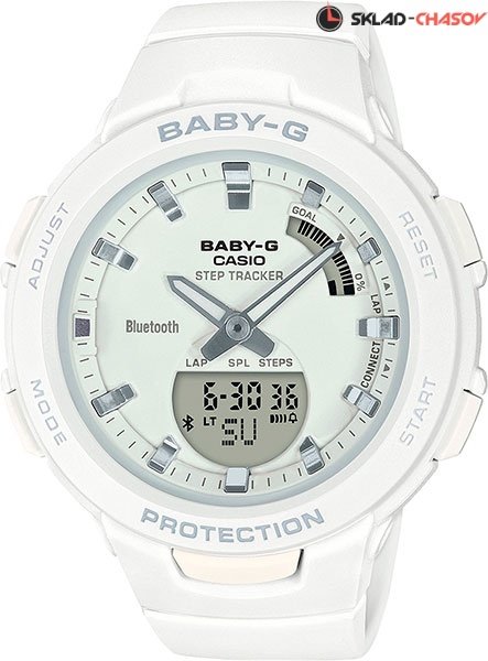 Первые BABY-G с поддержкой соединения Bluetooth и вашего смартфона, выполненные в стильном ярком дизайне, для еще большего удобства при занятиях спортом. G-SQUAD. Противоударный корпус защищает механизм от ударов и вибрации. Двойная подcветка: лицо и циферблат подсвечивается светодиодом, при недостаточном освещении во время поворота запястья подсветка включается автоматически. Светонакопительное покрытие необрит продолжает светиться в темноте даже после непродолжительного пребывания на свету. Шагомер измеряет количество шагов от 0 до 999999. Установка цели в диапазоне от 1000 до 50 000. Графическое отображение пройденных шагов за последние 11ч. Звуковое напоминание об отсутствии активности и достижении цели. Беспроводная технология Bluetooth® 4.0 со сверхнизким потреблением энергии для синхронизации со смартфоном. При подключении к смартфону часы корректируют текущее время, а также копируют настройки мирового времени. Приложение G-SHOCK Connected Phone позволяет настроить параметры для журнала счетчика шагов с пятью уровнями интенсивности упражнений, рассчитать сожженные калории и шаги. Приложение так же позволяет создавать комбинации таймера и отправлять их на часы, хранить данные измерений секундомера. Календарь тренировок с общим измерением интенсивности тренировок, которые разделены на 5 зон для возможности отслеживания уже совершённых и планирования будущих тренировок. Мировое время – 300 городов. Одновременное отображение текущего времени в двух разных часовых поясах. 12-ти и 24-х часовой формат времени. Секундомер с двумя точностями показаний: 1/100с (до 1ч) и 1с (после 1ч) и временем измерения 24ч. Память на 200 этапов (дата, время, время круга). Возможность установить 10 целевых таймеров. Таймер обратного отсчета от 1мин до 1ч с автоповтором. Количество повторений таймера устанавливается от 1 до 20. Функция перемещения стрелок для беспрепятственного просмотра информации на цифровых дисплеях. Функция отключения/включения звука.