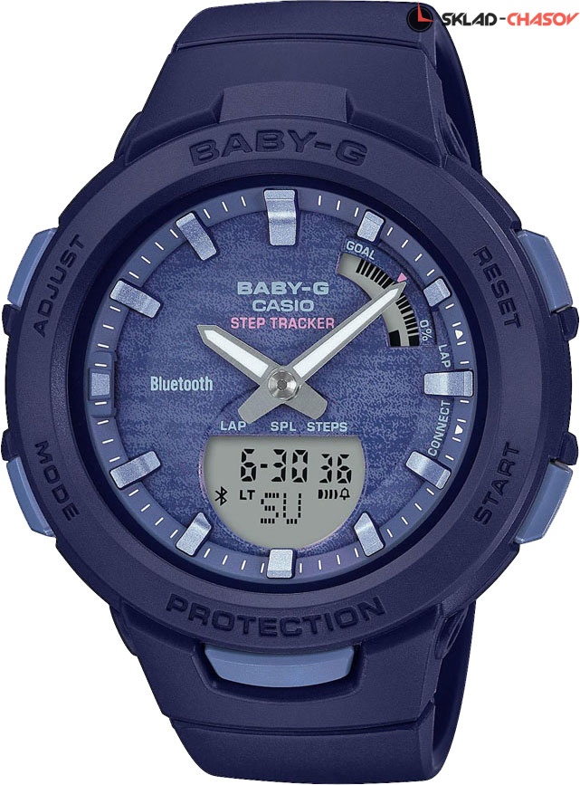 Эти современные часы просто необходимы девушкам, которые ведут активный образ жизни. G-SQUAD. Новый вариант расцветки в серии часов BSA-B100. Цвета новинок передают идею окружающего мира в первозданном виде. Противоударный корпус защищает механизм от ударов и вибрации. Светодиодная автоматическая супер-подсветка. При движении руки дисплей освещается ярким светом. Необритовое светонакопительное покрытие обеспечивает длительное послесвечение в темноте даже после кратковременного нахождения на свету. Цвет подсветки - белый. 3-осевой акселерометр автоматически начинает отсчет шагов на дисплее, когда вы начинаете бегать или участвовать в других действиях во время ношения часов. Шагомер измеряет количество шагов от 0 до 999999. Графическое отображение пройденных шагов за последние 11ч. Установка цели в диапазоне от 1000 до 50 000. Звуковое напоминание об отсутствии активности и достижении цели. Беспроводная технология Bluetooth® 4.0 со сверхнизким потреблением энергии для синхронизации со смартфоном. При подключении к смартфону часы корректируют текущее время, а также копируют настройки мирового времени. Приложение G-SHOCK Connected Phone позволяет настроить параметры для журнала счетчика шагов с пятью уровнями интенсивности упражнений, рассчитать сожженные калории и шаги. Приложение так же позволяет создавать комбинации таймера и отправлять их на часы, хранить данные измерений секундомера. Календарь тренировок с общим измерением интенсивности тренировок, которые разделены на 5 зон для возможности отслеживания уже совершённых и планирования будущих тренировок. Мировое время – 300 городов. Одновременное отображение текущего времени в двух разных часовых поясах. 12-ти и 24-х часовой формат времени. Секундомер с двумя точностями показаний: 1/100с (до 1ч) и 1с (после 1ч) и временем измерения 24ч. Сплит-хронограф. Память на 200 этапов (дата, время, время круга). Возможность установить 10 целевых таймеров. Таймер обратного отсчета от 1сек до 1ч с автоповтором до 20 раз. Функции поиска телефона, перемещения стрелок для беспрепятственного просмотра информации на цифровых дисплеях, отключения/включения звука.