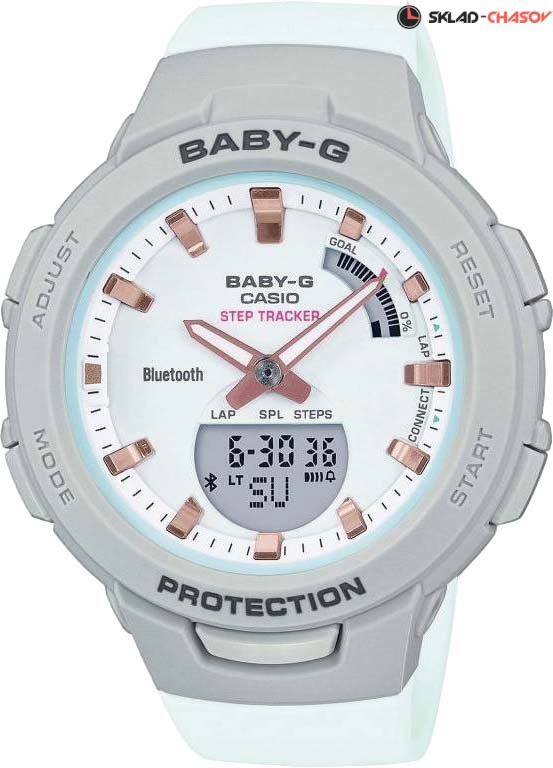 Эти современные часы просто необходимы девушкам, которые ведут активный образ жизни. G-SQUAD. Новый вариант расцветки в серии часов BSA-B100. Противоударный корпус защищает механизм от ударов и вибрации. Двойная подcветка: лицо и циферблат подсвечиваются светодиодом, благодаря наличию функции задержки, после отпускания кнопки освещение горит еще несколько секунд. Цвет подсветки - белый. Необритовое светонакопительное покрытие обеспечивает длительное послесвечение в темноте даже после кратковременного нахождения на свету. Второй часовой пояс. 12-ти и 24-х часовой формат времени. Секундомер с двумя точностями показаний: 1/100с (до 1ч) и 1с (после 1ч) и временем измерения 24ч. SPLIT-хронограф. Память на 200 этапов (дата, время, время круга). Возможность установить 10 целевых таймеров. Таймер обратного отсчета от 1сек до 1ч с автоповтором до 20 раз. Одновременное отображение текущего времени в двух разных часовых поясах. Беспроводная технология Bluetooth® 4.0 со сверхнизким потреблением энергии для синхронизации со смартфоном. При подключении к смартфону часы корректируют текущее время, а также копируют настройки мирового времени. 3-осевой акселерометр автоматически начинает отсчет шагов на дисплее, когда вы начинаете бегать или участвовать в других действиях во время ношения часов. Шагомер измеряет количество шагов от 0 до 999999. Графическое отображение пройденных шагов за последние 11ч. Установка цели в диапазоне от 1000 до 50000. Звуковое напоминание об отсутствии активности и достижении цели. Приложение BABY-G Connected позволяет настроить параметры для журнала счетчика шагов с пятью уровнями интенсивности упражнений, создавать комбинации таймера и отправлять их на часы, хранить данные измерений секундомера. Календарь тренировок с общим измерением интенсивности тренировок, которые разделены на 5 зон для возможности отслеживания уже совершённых и планирования будущих тренировок. Функции поиска телефона, перемещения стрелок для беспрепятственного просмотра информации на цифровых дисплеях, отключения/включения звука. Ремешок с классической застежкой.