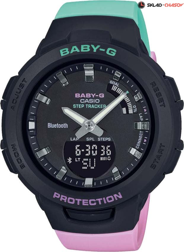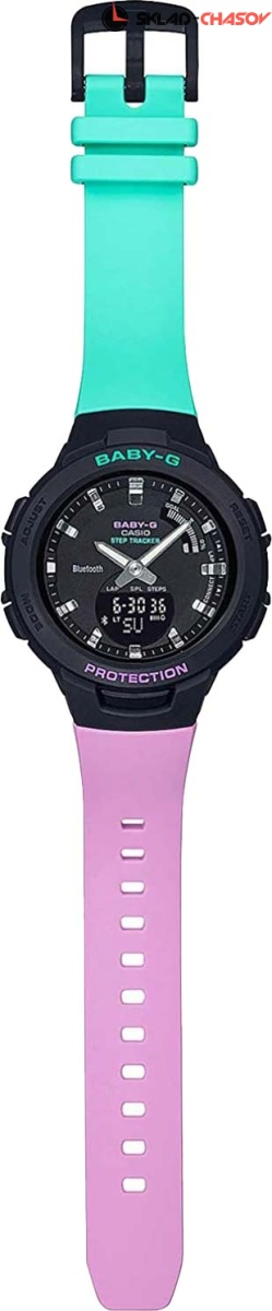 Эти современные часы просто необходимы девушкам, которые ведут активный образ жизни. G-SQUAD. Новый вариант расцветки в серии часов BSA-B100. Противоударный корпус защищает механизм от ударов и вибрации. Двойная подcветка: лицо и циферблат подсвечиваются светодиодом, благодаря наличию функции задержки, после отпускания кнопки освещение горит еще несколько секунд. Цвет подсветки - белый. Необритовое светонакопительное покрытие обеспечивает длительное послесвечение в темноте даже после кратковременного нахождения на свету. Второй часовой пояс. 12-ти и 24-х часовой формат времени. Секундомер с двумя точностями показаний: 1/100с (до 1ч) и 1с (после 1ч) и временем измерения 24ч. SPLIT-хронограф. Память на 200 этапов (дата, время, время круга). Возможность установить 10 целевых таймеров. Таймер обратного отсчета от 1сек до 1ч с автоповтором до 20 раз. Одновременное отображение текущего времени в двух разных часовых поясах. Беспроводная технология Bluetooth® 4.0 со сверхнизким потреблением энергии для синхронизации со смартфоном. При подключении к смартфону часы корректируют текущее время, а также копируют настройки мирового времени. 3-осевой акселерометр автоматически начинает отсчет шагов на дисплее, когда вы начинаете бегать или участвовать в других действиях во время ношения часов. Шагомер измеряет количество шагов от 0 до 999999. Графическое отображение пройденных шагов за последние 11ч. Установка цели в диапазоне от 1000 до 50000. Звуковое напоминание об отсутствии активности и достижении цели. Приложение BABY-G Connected позволяет настроить параметры для журнала счетчика шагов с пятью уровнями интенсивности упражнений, создавать комбинации таймера и отправлять их на часы, хранить данные измерений секундомера. Календарь тренировок с общим измерением интенсивности тренировок, которые разделены на 5 зон для возможности отслеживания уже совершённых и планирования будущих тренировок. Функции поиска телефона, перемещения стрелок для беспрепятственного просмотра информации на цифровых дисплеях, отключения/включения звука. Ремешок с классической застежкой.