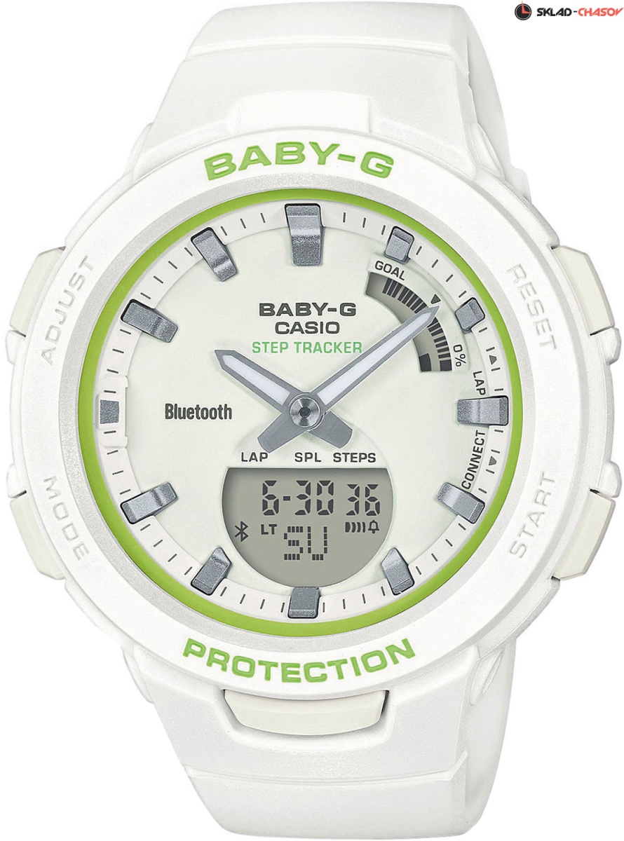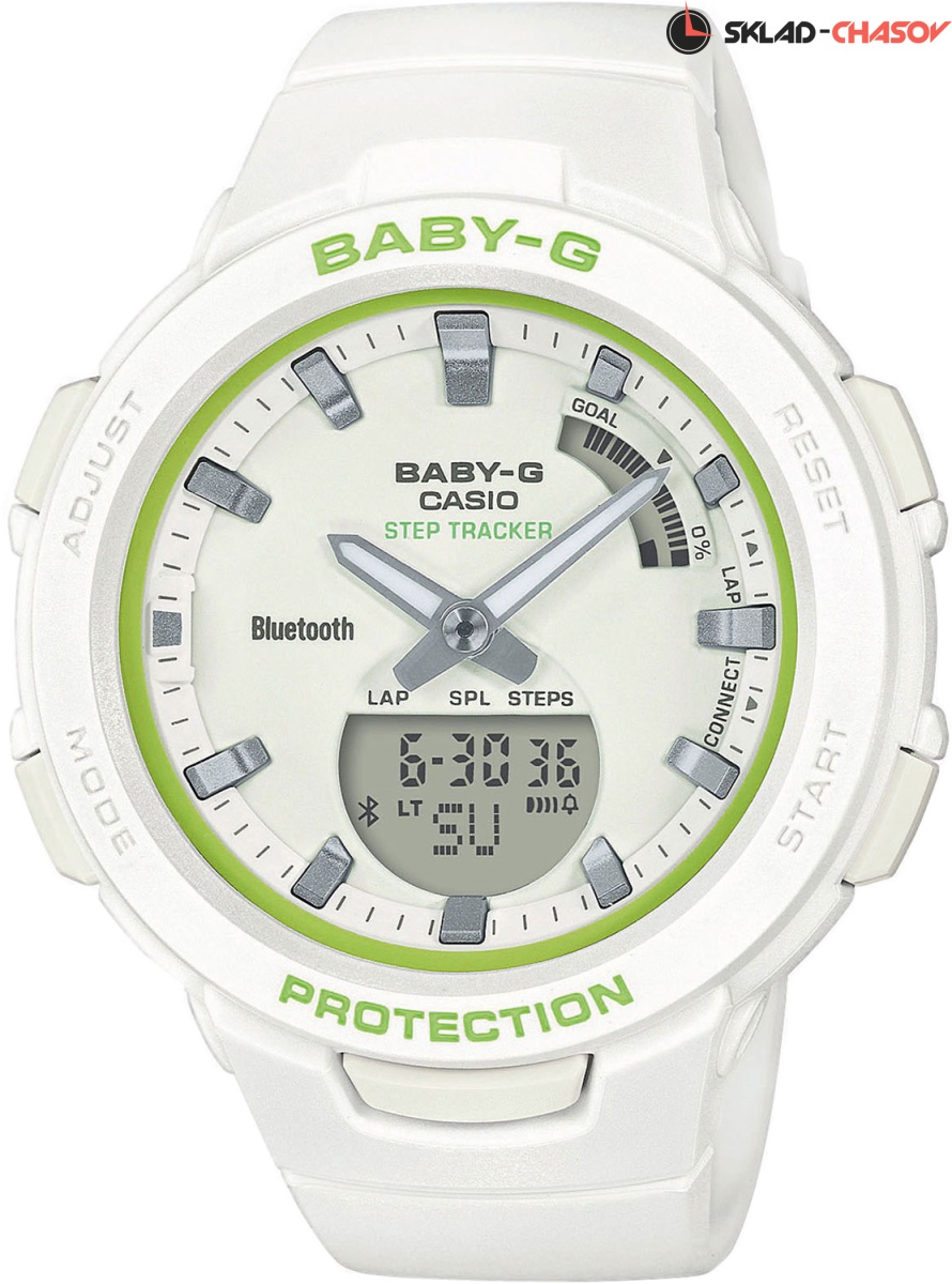 Противоударные часы Baby-G созданы для девушек, которые не представляют свою жизнь без спорта и приключений. G-SQUAD. Противоударный корпус защищает механизм от ударов и вибрации. Необритовое светонакопительное покрытие обеспечивает длительное послесвечение в темноте даже после кратковременного нахождения на свету. Двойная подcветка: лицо и циферблат подсвечиваются светодиодом, благодаря наличию функции задержки, после отпускания кнопки освещение горит еще несколько секунд. Цвет подсветки: белый. 3-осевой акселерометр автоматически начинает отсчет шагов на дисплее, когда вы начинаете бегать или участвовать в других действиях во время ношения часов. Шагомер измеряет количество шагов от 0 до 999999. Графическое отображение пройденных шагов за последние 11ч. Установка цели в диапазоне от 1000 до 50 000. Звуковое напоминание об отсутствии активности и достижении цели. Беспроводная технология Bluetooth® 4.0 со сверхнизким потреблением энергии для синхронизации со смартфоном. При подключении к смартфону часы корректируют текущее время, а также копируют настройки мирового времени. Приложение G-SHOCK Connected Phone позволяет настроить параметры для журнала счетчика шагов с пятью уровнями интенсивности упражнений, рассчитать сожженные калории и шаги. Приложение так же позволяет создавать комбинации таймера и отправлять их на часы, хранить данные измерений секундомера. Календарь тренировок с общим измерением интенсивности тренировок, которые разделены на 5 зон для возможности отслеживания уже совершённых и планирования будущих тренировок. Мировое время – 300 городов. Одновременное отображение текущего времени в двух разных часовых поясах. 12-ти и 24-х часовой формат времени. Секундомер с двумя точностями показаний: 1/100с (до 1ч) и 1с (после 1ч) и временем измерения 24ч. Память на 200 этапов (дата, время, время круга). Возможность установить 10 целевых таймеров. Таймер обратного отсчета от 1сек до 1ч с автоповтором, позволяет создавать до 20 комбинаций по 5 таймеров в каждой. Функции поиска телефона, перемещения стрелок для беспрепятственного просмотра информации на цифровых дисплеях, отключения/включения звука..