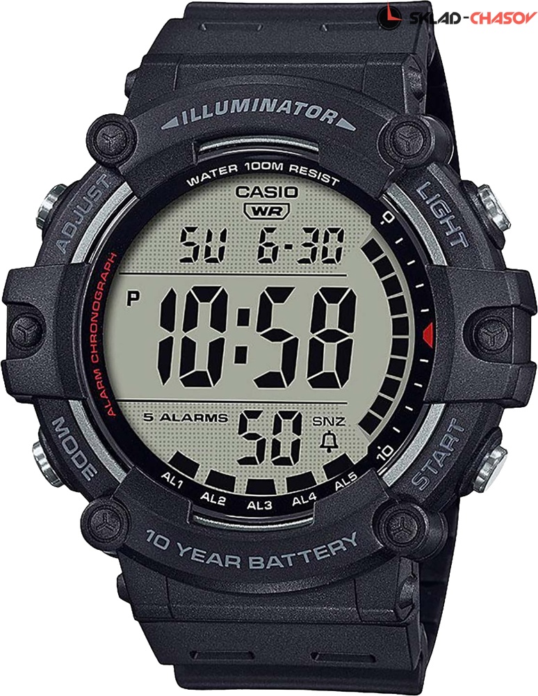Спортивные многофункциональные часы Casio с цифровым отображением времени. Циферблат подсвечивается светодиодом оранжевого света, дополнен функцией послесвечения. Второй часовой пояс. 12-ти и 24-х часовой формат времени. Секундомер с точностью показаний 1/100 сек. и временем измерения 24 часа, SPLIT-хронограф. Таймер обратного отсчета от 1 минуты до 24 часов с автоповтором. Функция включения/отключения звука кнопок. 5 будильников, один с функцией Snooze, ежечасный сигнал. Водонепроницаемость в соответствии с ISO 2281. Батарея рассчитана на 10 лет. Ремешок с классической застежкой. Гарантия 2 года.