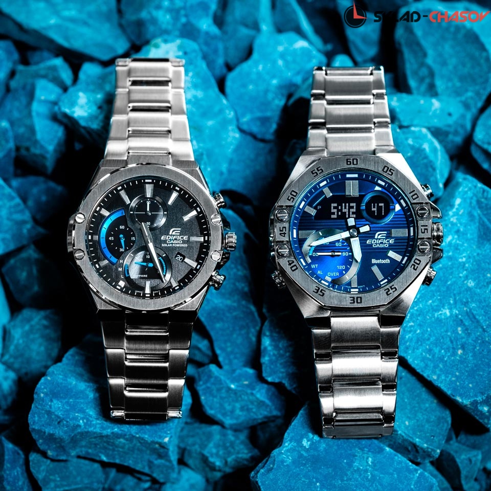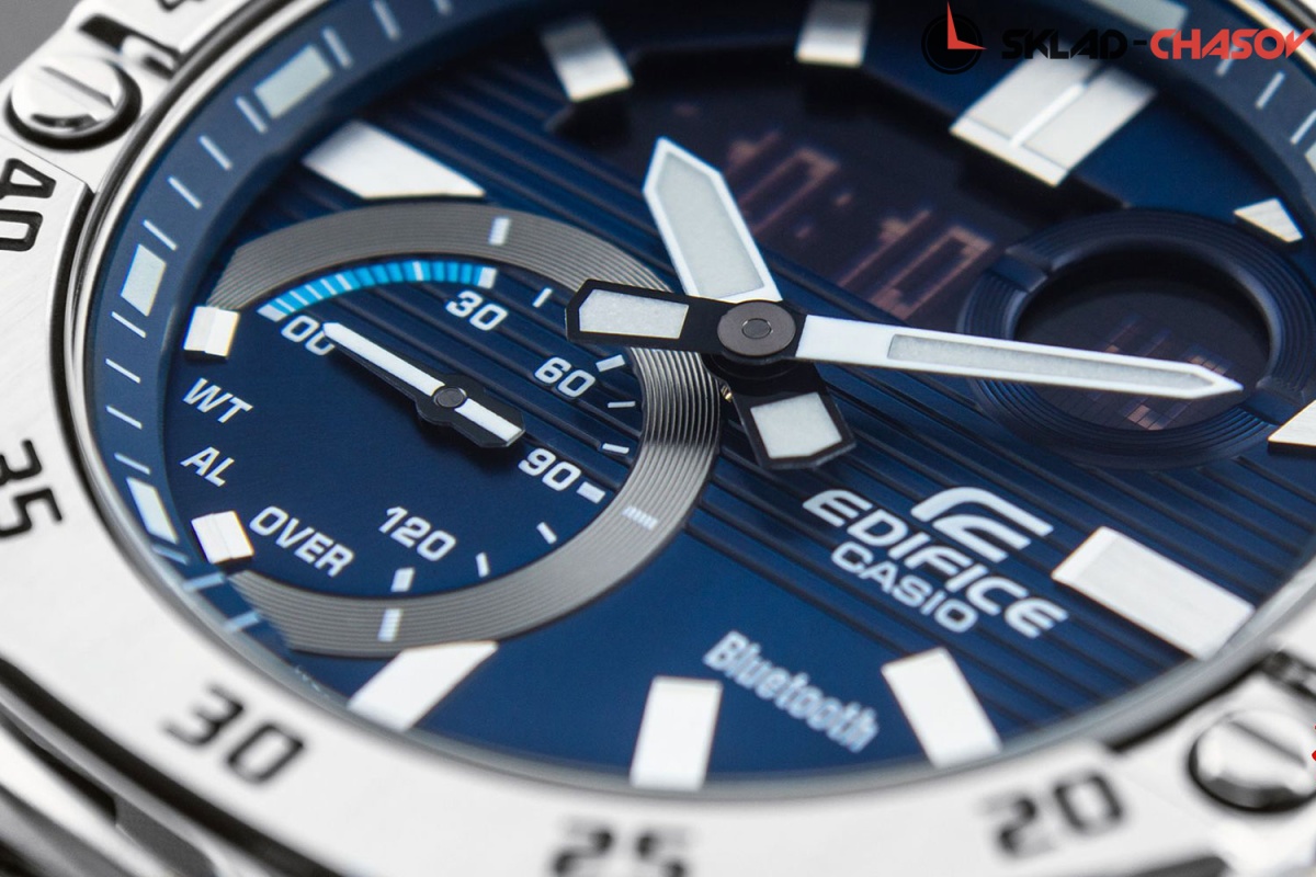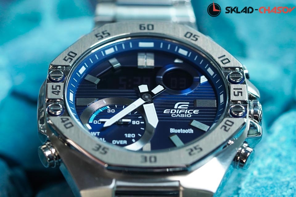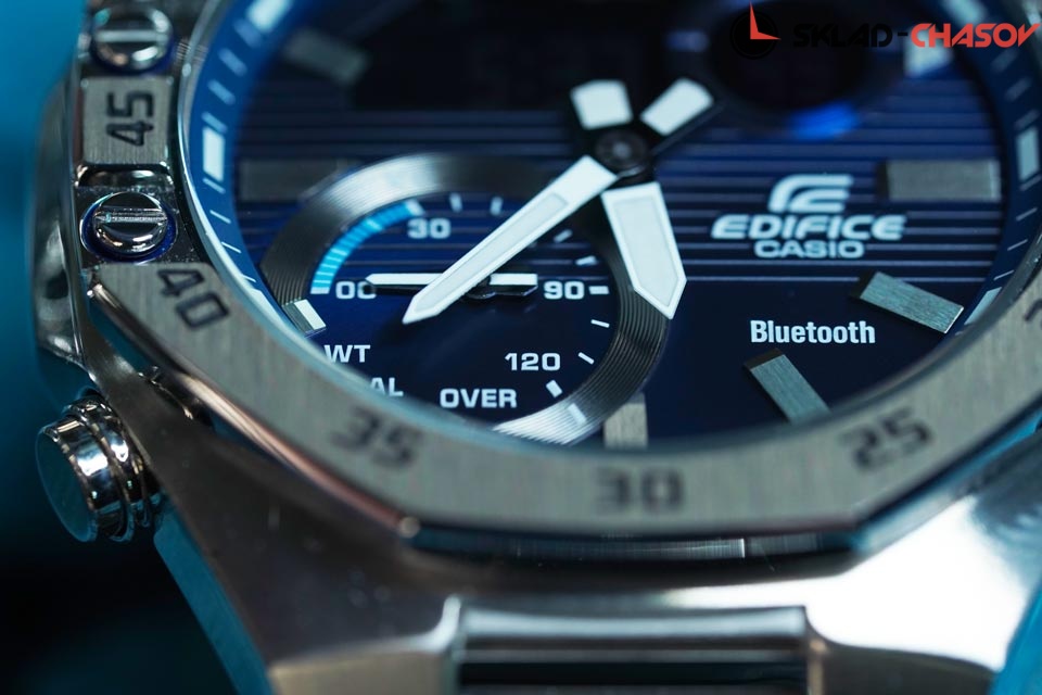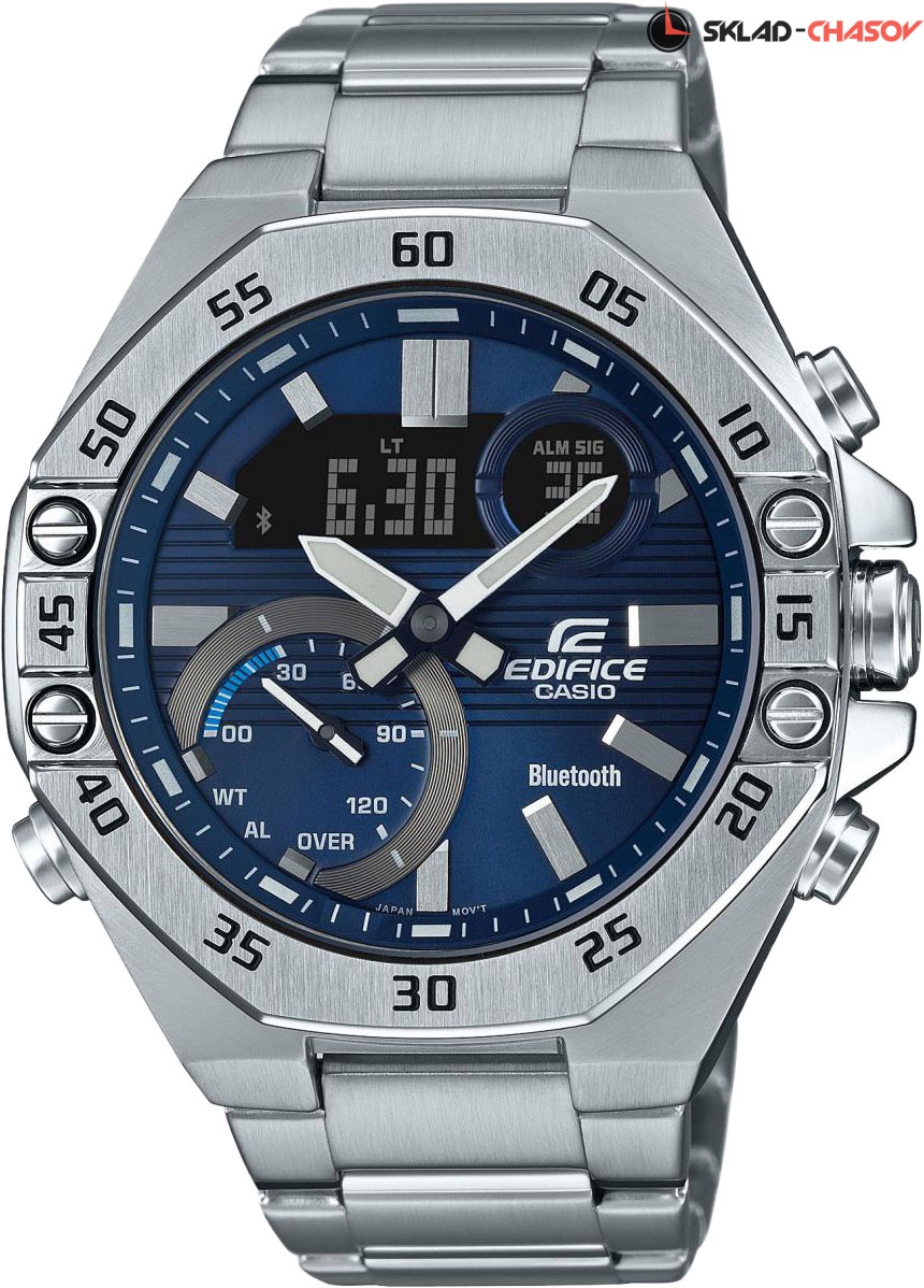 Новинка в серии Edifice ECB - многофункциональный аксессуар который станет настоящим помощником для настоящего мужчины. Edifice. Новинка в серии Edifice ECB. Циферблат подсвечивается ярким светодиодом. Цвет подсветки: белый. Необритовое светонакопительное покрытие обеспечивает длительное послесвечение в темноте даже после кратковременного нахождения на свету. Мировое время – 38 городов (38 часовых поясов). Функция включения/отключения летнего времени. Секундомер с двумя точностями показаний: 1/1000с (до 1ч) и 1/10с (после 1ч) и временем измерения 24ч. SPLIT-хронограф. Таймер обратного отсчета от 1с до 24ч. Таймер расписания синхронизируется с календарем в смартфоне и производит обратный отсчет до начала назначенного в календаре события. 12-ти и 24-х часовой формат времени. Беспроводная технология Bluetooth® 4.0 со сверхнизким потреблением энергии для синхронизации со смартфоном. При подключении к смартфону часы автоматически корректируют текущее время, в том числе переход на зимнее/летнее время, копируют настройки мирового времени более чем для 300 городов, оповещают при поступлении звонка на мобильный телефон. Приложение EDIFICE Connected позволяет вести журнал показаний секундомера и прохождения этапов, вычислять разность между заданным временем и временем этапа. Отображение дней недели на разных языках. Авиарежим - часы переключаются в режим офлайн нажатием кнопки. Функции перемещения стрелок для беспрепятственного просмотра информации на цифровых дисплеях, отключения/включения звука и поиска телефона. Заводная головка с защитой. Раскладывающаяся застежка, расстегиваемая одним касанием. Застежка с системой блокировки.