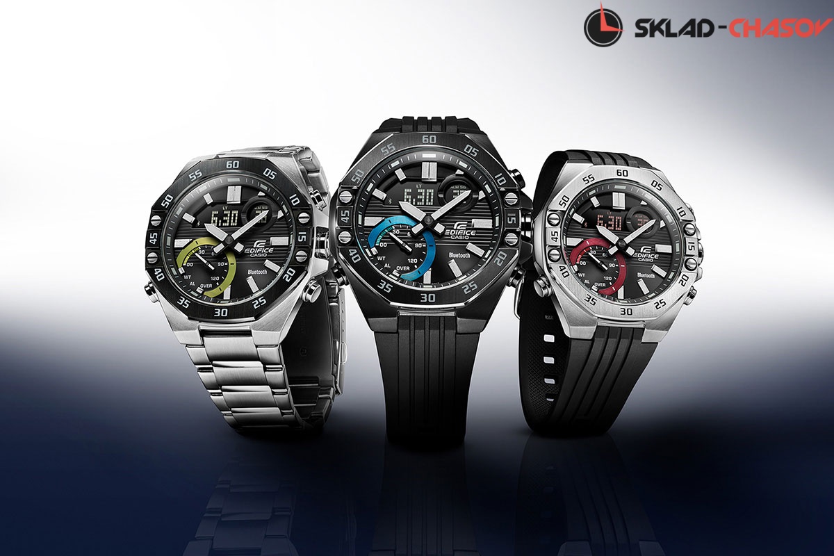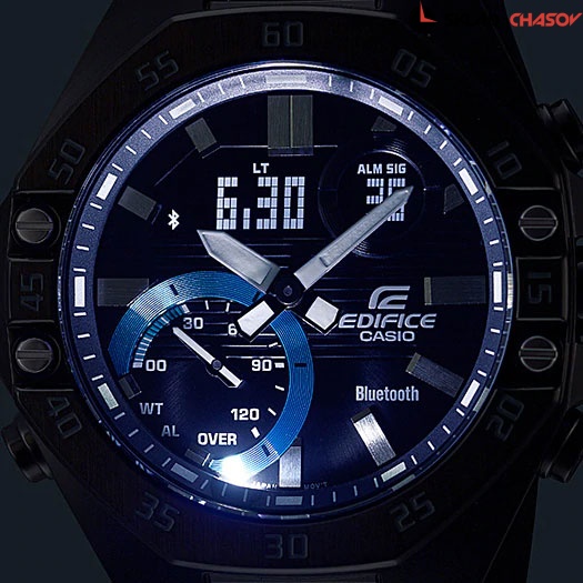 Новинка в серии Edifice ECB - многофункциональный аксессуар который станет настоящим помощником для настоящего мужчины. Edifice. Новинка в серии Edifice ECB. Циферблат подсвечивается ярким светодиодом. Цвет подсветки: белый. Необритовое светонакопительное покрытие обеспечивает длительное послесвечение в темноте даже после кратковременного нахождения на свету. Мировое время – 38 городов (38 часовых поясов). Функция включения/отключения летнего времени. Секундомер с двумя точностями показаний: 1/1000с (до 1ч) и 1/10с (после 1ч) и временем измерения 24ч. SPLIT-хронограф. Таймер обратного отсчета от 1с до 24ч. Таймер расписания синхронизируется с календарем в смартфоне и производит обратный отсчет до начала назначенного в календаре события. 12-ти и 24-х часовой формат времени. Беспроводная технология Bluetooth® 4.0 со сверхнизким потреблением энергии для синхронизации со смартфоном. При подключении к смартфону часы автоматически корректируют текущее время, в том числе переход на зимнее/летнее время, копируют настройки мирового времени более чем для 300 городов, оповещают при поступлении звонка на мобильный телефон. Приложение EDIFICE Connected позволяет вести журнал показаний секундомера и прохождения этапов, вычислять разность между заданным временем и временем этапа. Отображение дней недели на разных языках. Авиарежим - часы переключаются в режим офлайн нажатием кнопки. Функции перемещения стрелок для беспрепятственного просмотра информации на цифровых дисплеях, отключения/включения звука и поиска телефона. Заводная головка с защитой. Ремешок из полимерного материала.